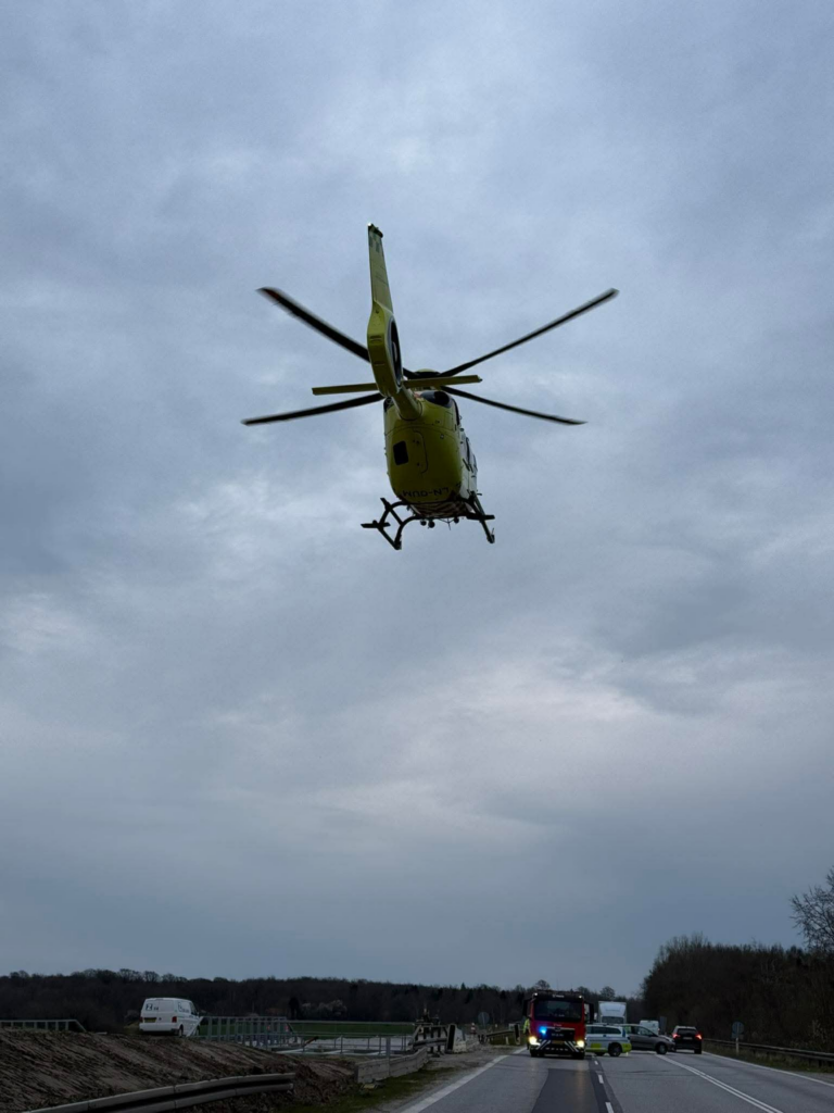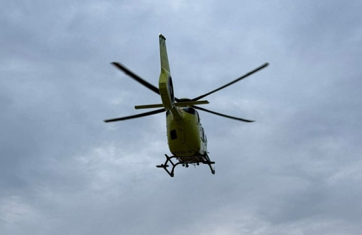 En lægehelikopter lander midt på vejen, mens stedet er omringet af udrykningskøretøjer, der holder med deres blå blink tændt.