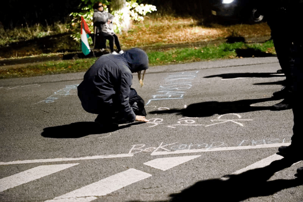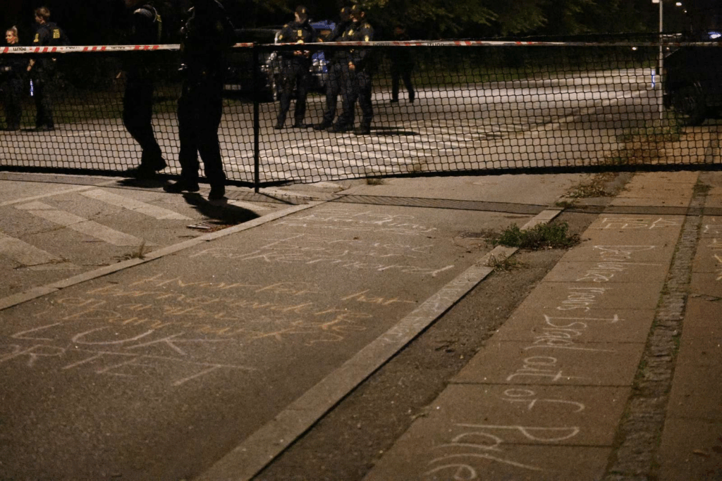 Adskillige gloser malet med forskelligfarvet kridt pryder asfalten foran den afspærring politiet onsdag har opsat.