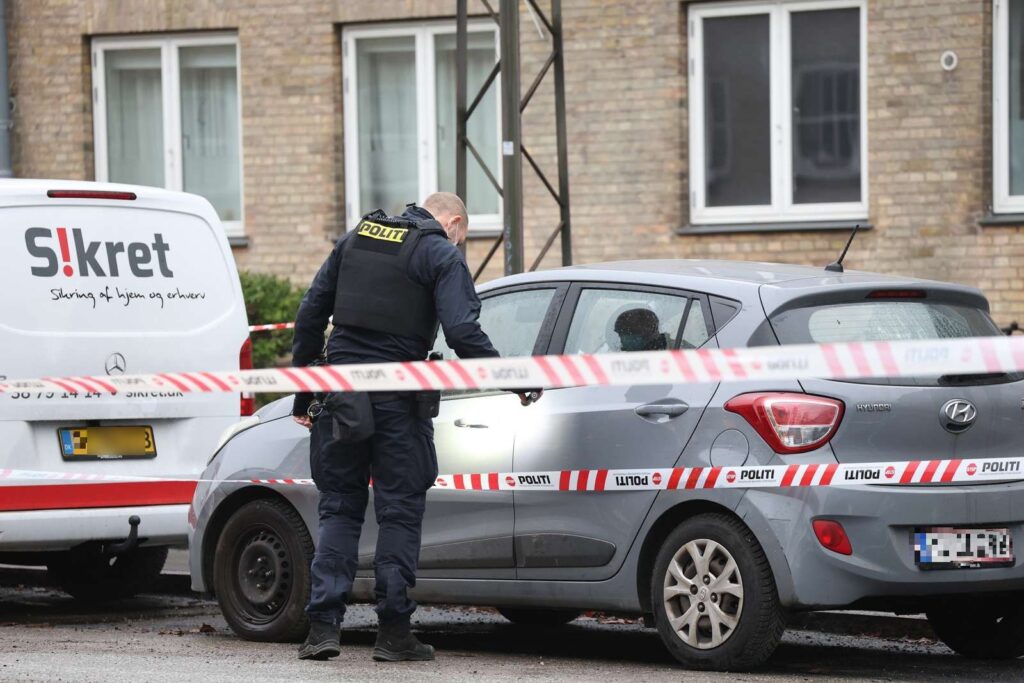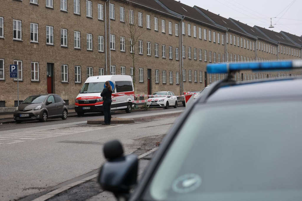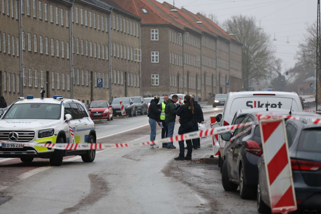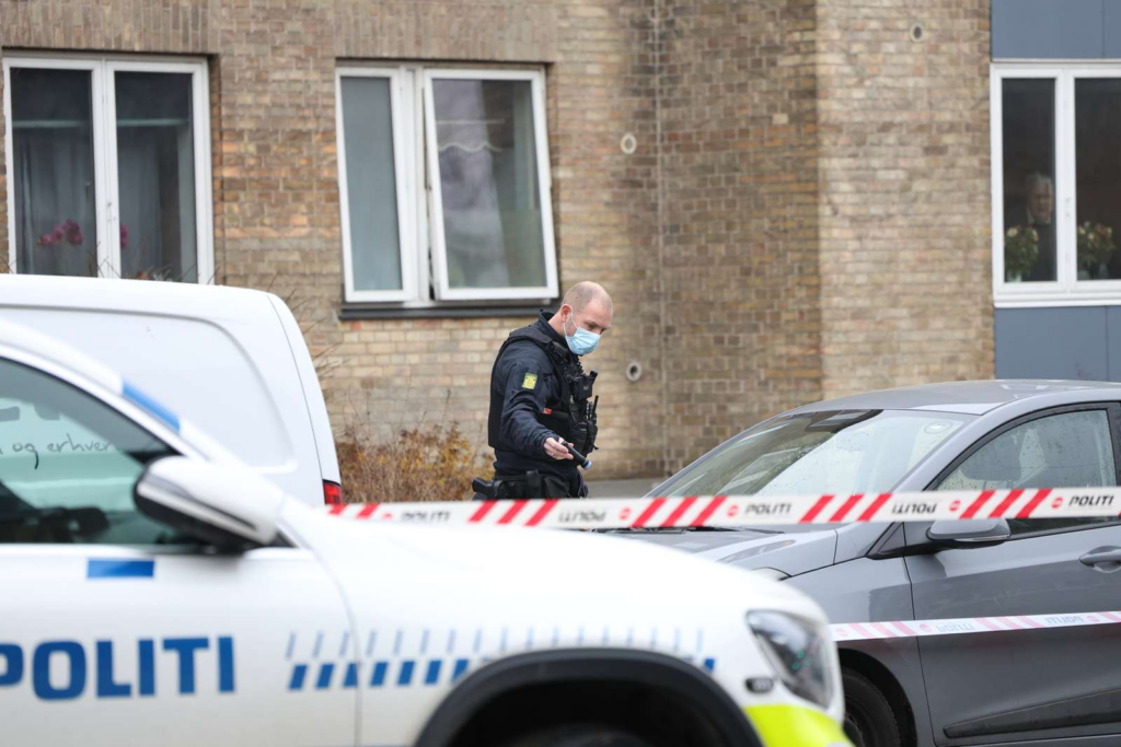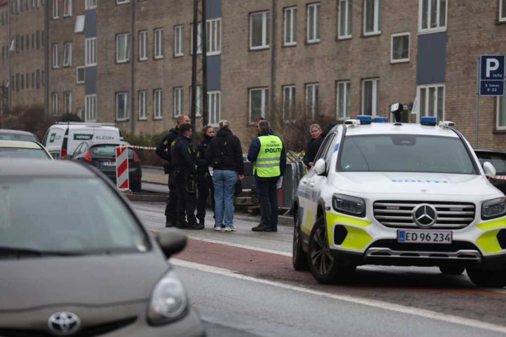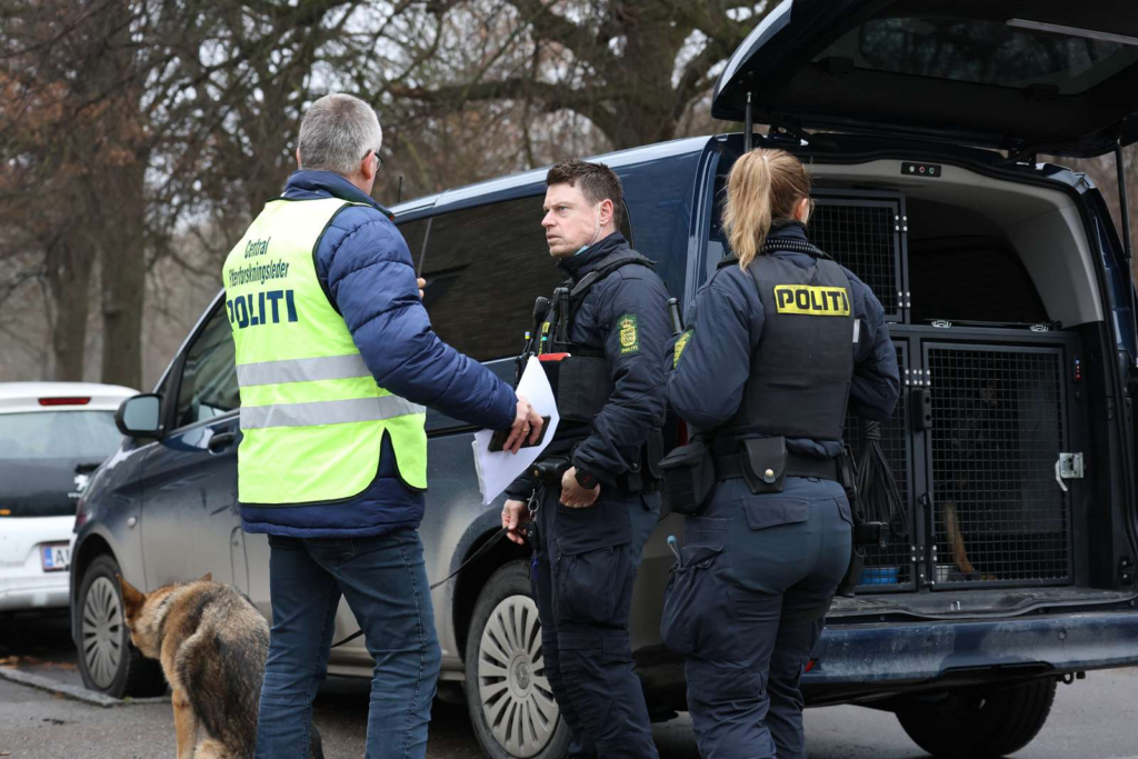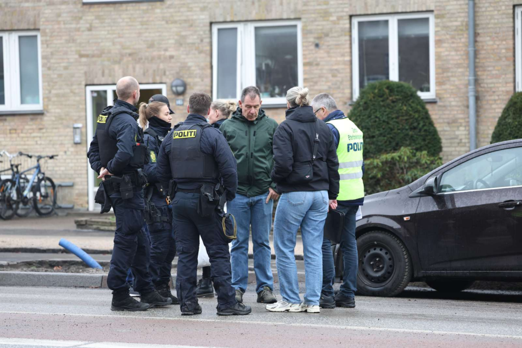 “Politiet har afspærret et større område omkring en etageejendom. Betjente søger med hunde foran bygningen og omkring biler på vejen.”