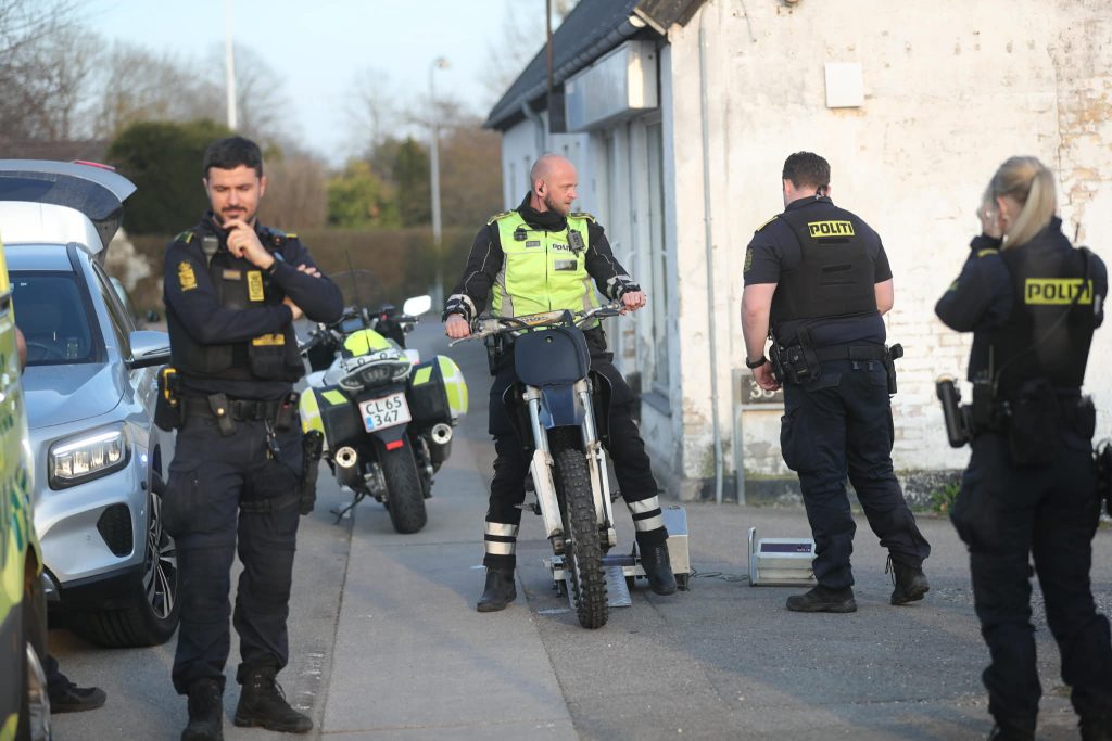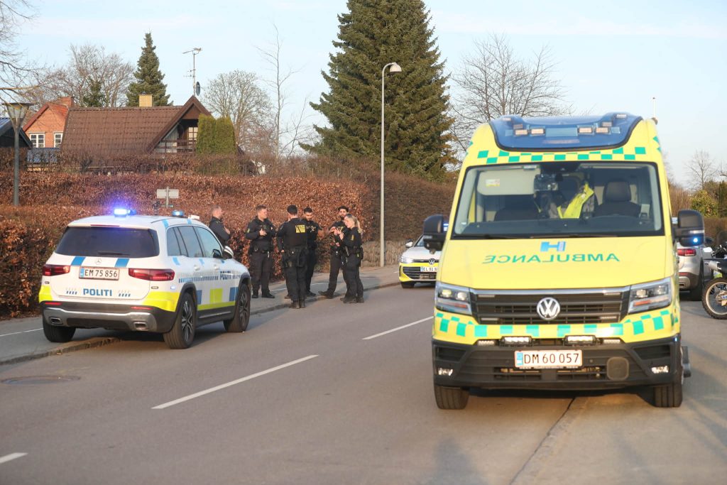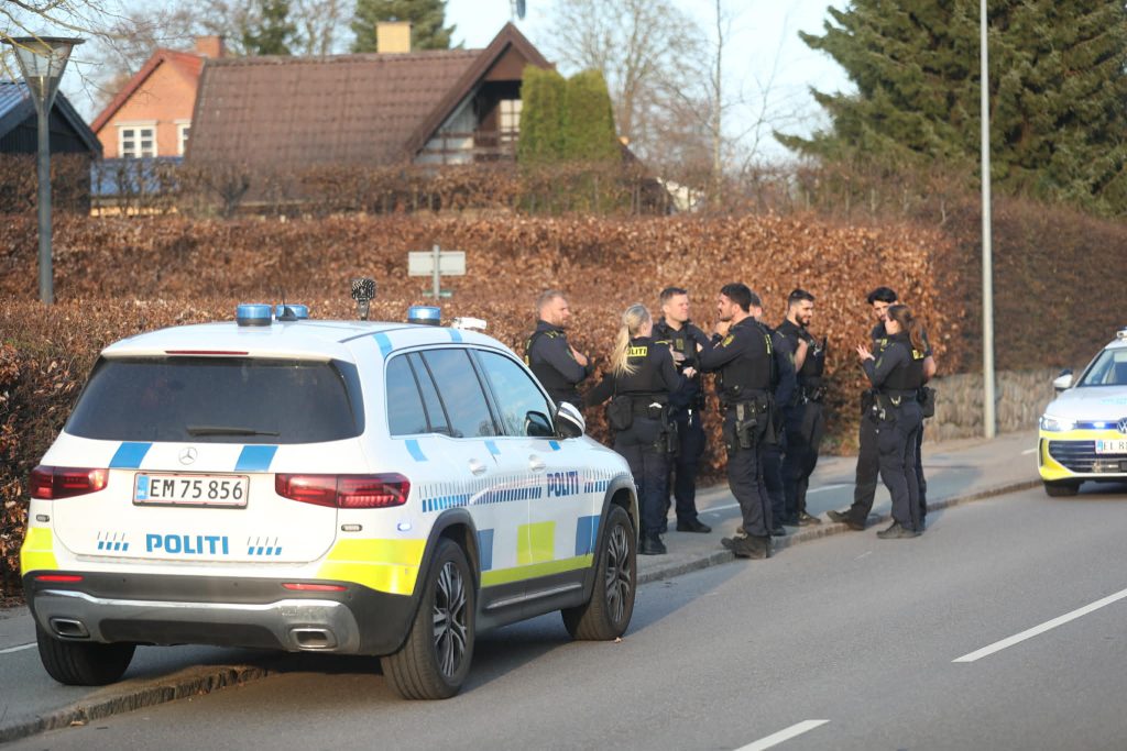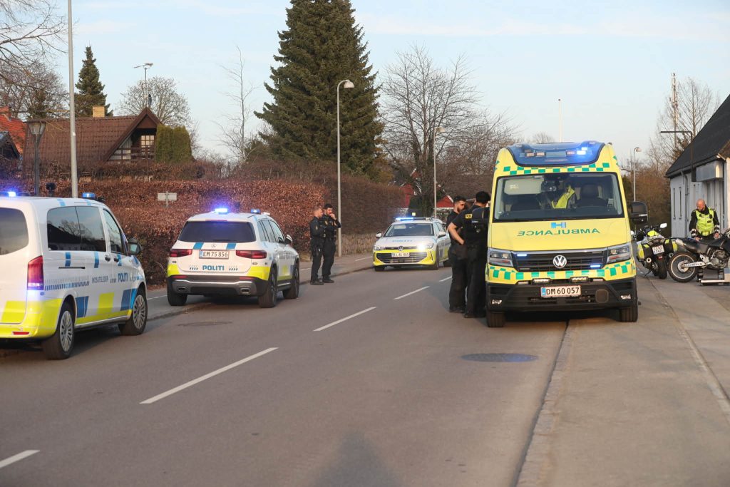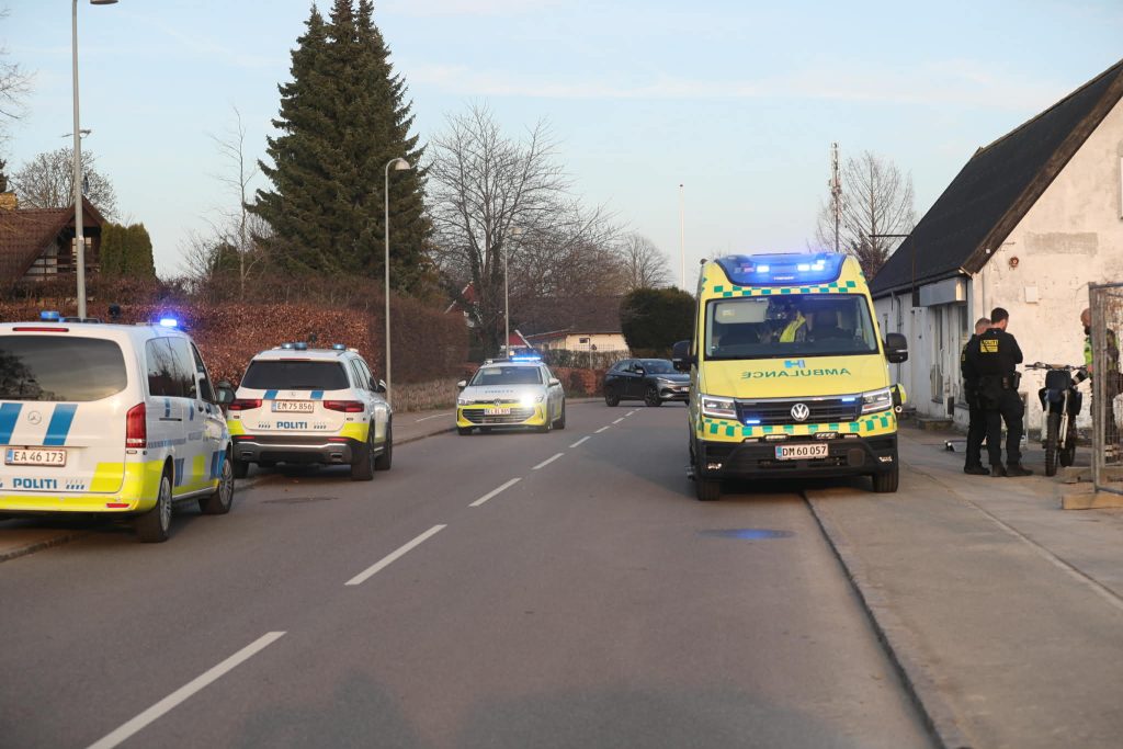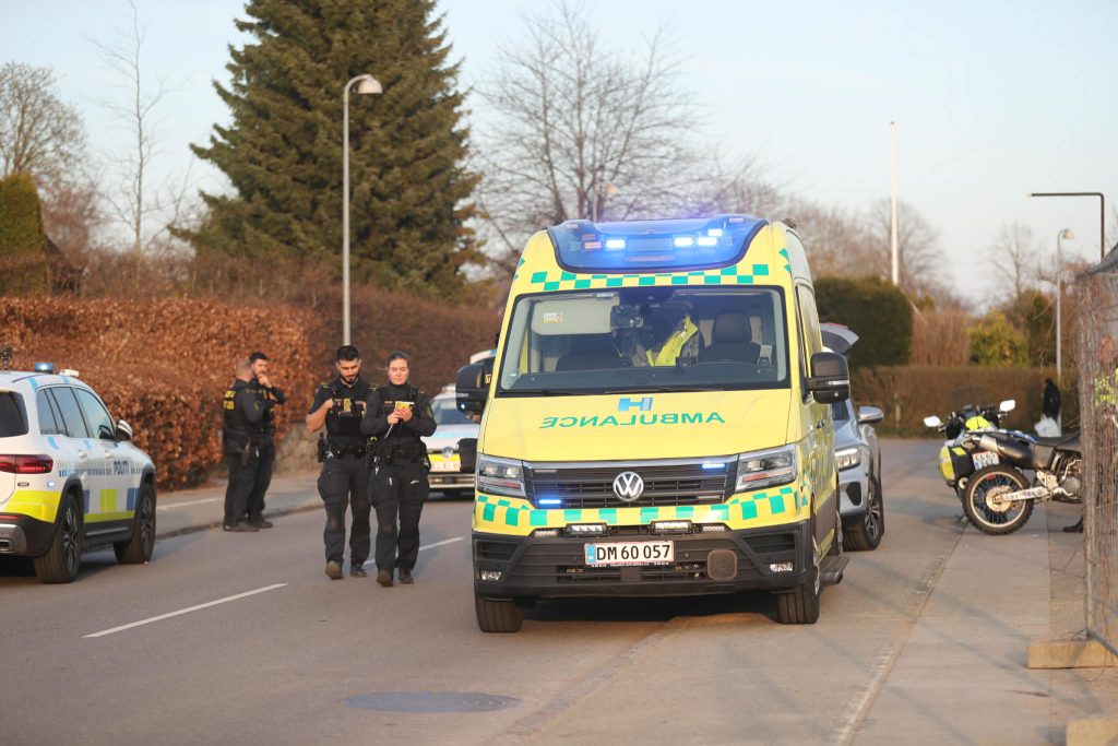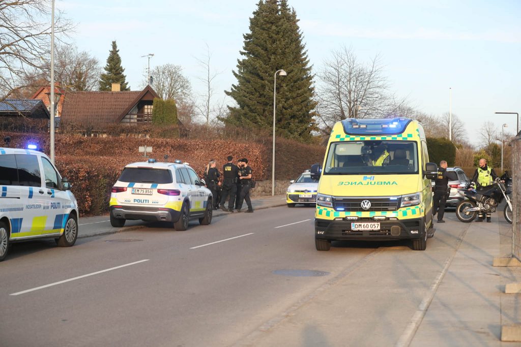 En større udrykning af politistyrker er rykket frem, mens også en ambulance med blå blink holder der.