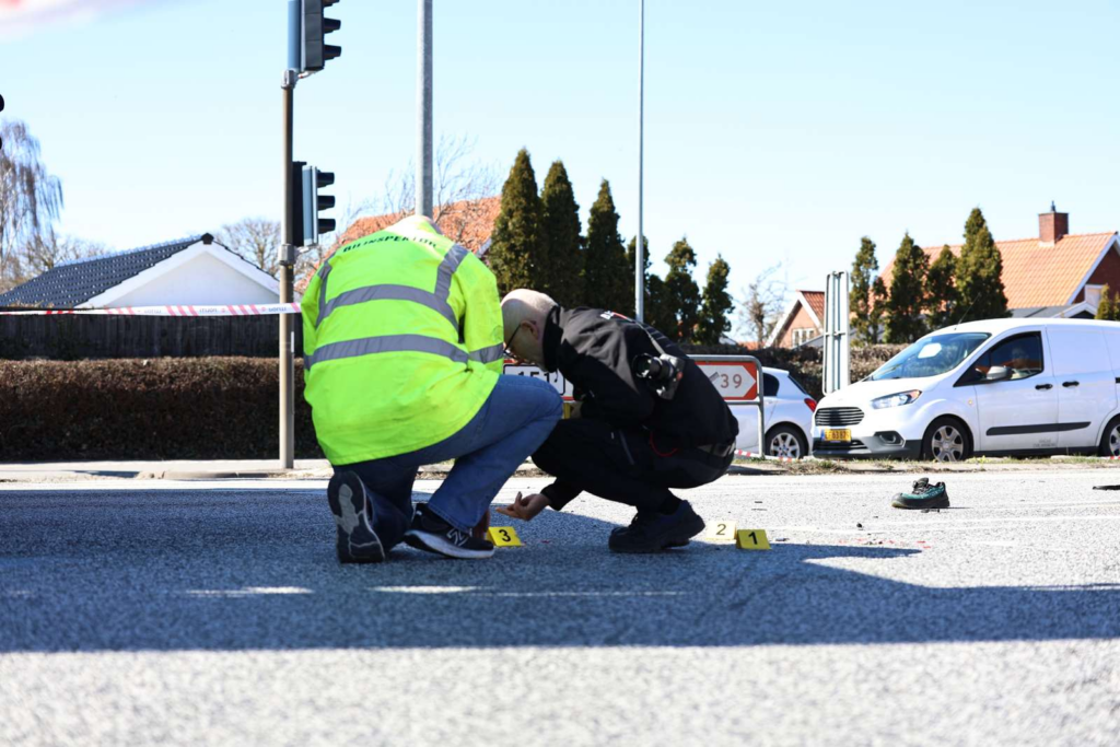 “Der er et blodspor på vejen. Der ligger også en sko. Mange brandfolk er her sammen med politiet og ambulance. En bilinspektør er i færd med at foretage undersøgelser af ulykkesstedet,” siger Presse-fotos.dks udsendte.