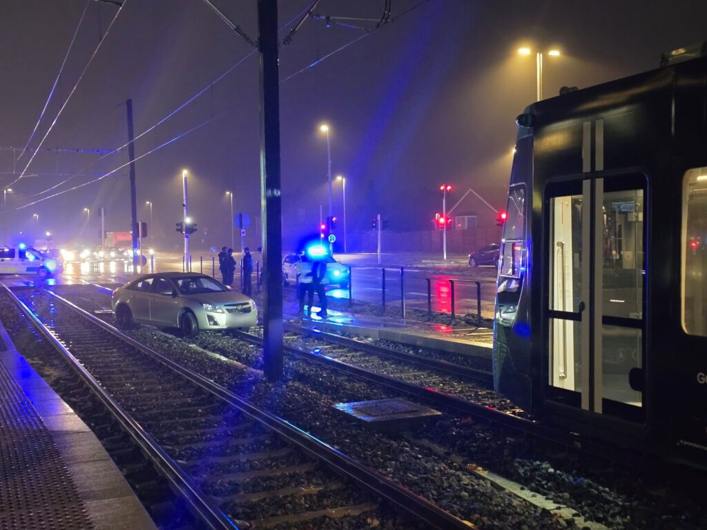 En billist er tirsdag morgen kørt galt og endt foran et letbanetog på travl strækning.