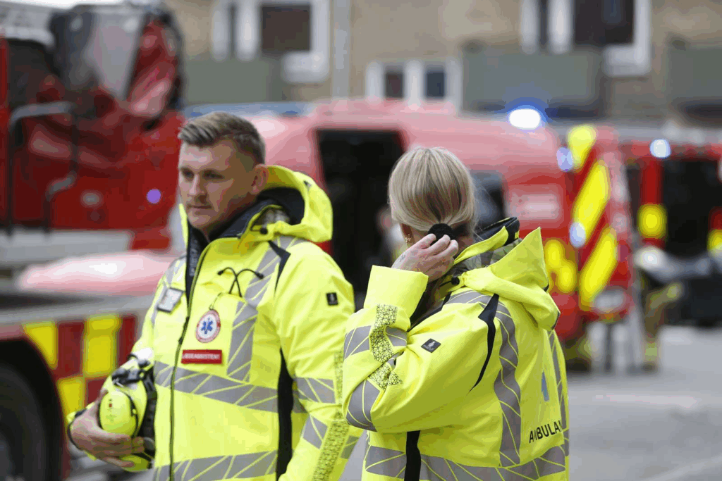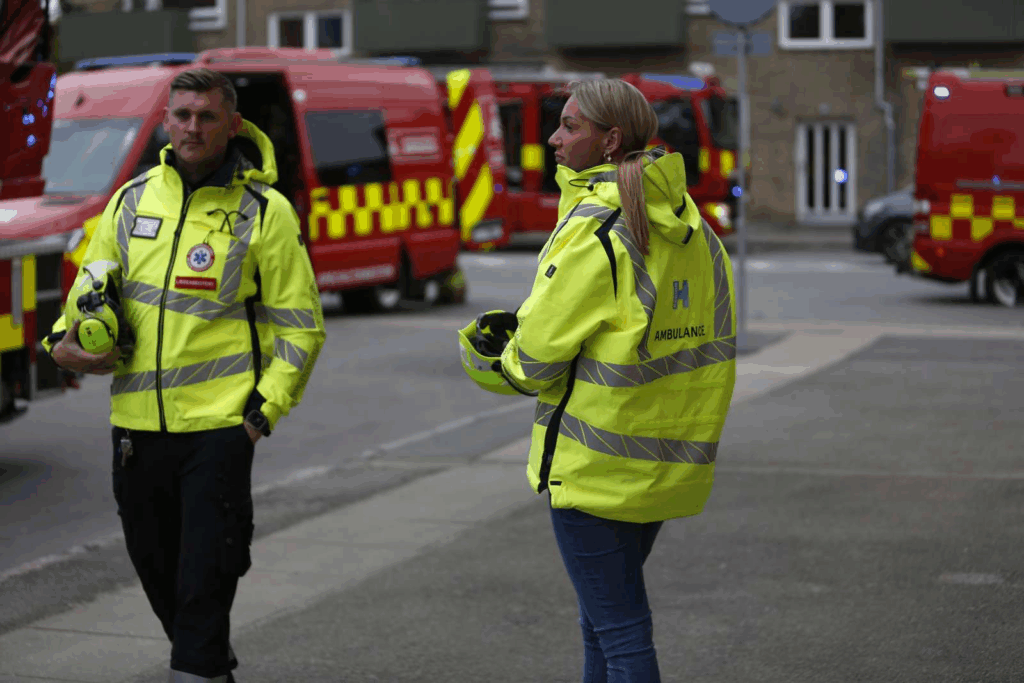 “Der er rigtig meget politi, meget brandvæsen – en ambulance og en akutlægebil. Der er en del mennesker, som står og kigger på,” siger vores udsendte.