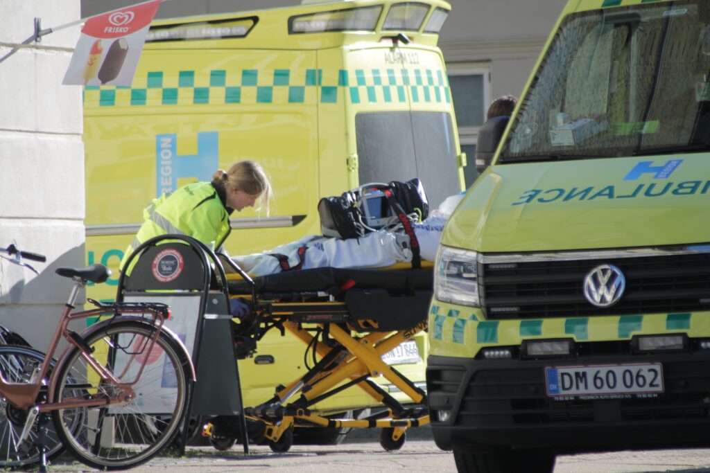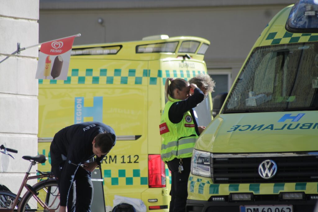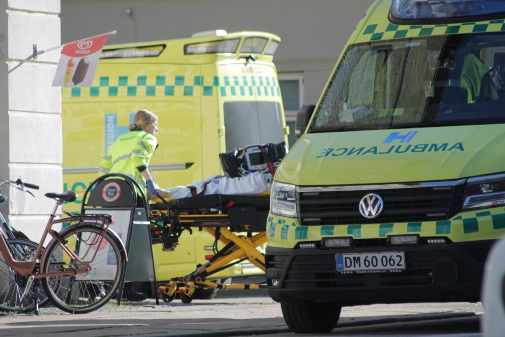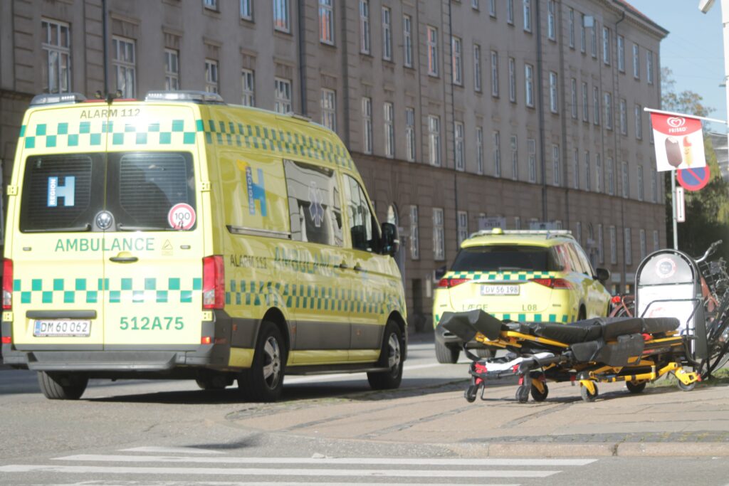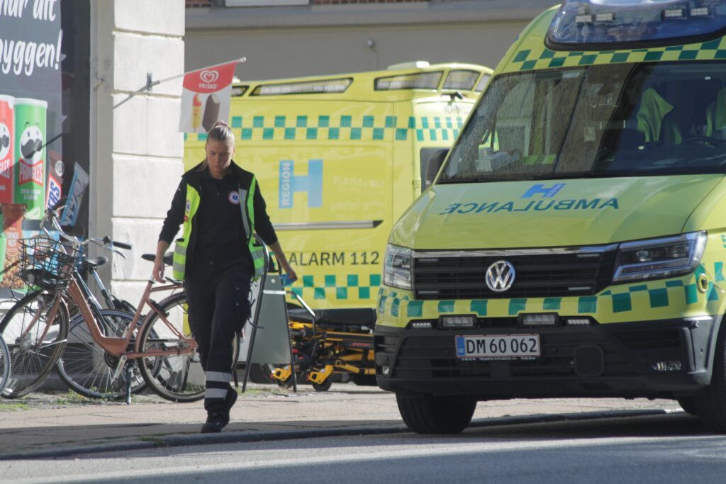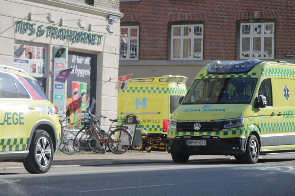 Ambulancen forlod stedet med blå blink og høj fart.