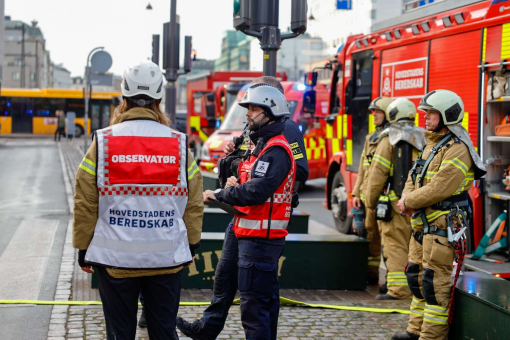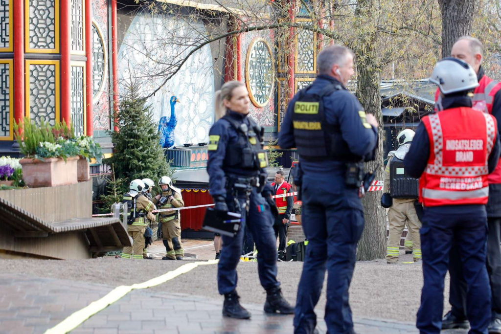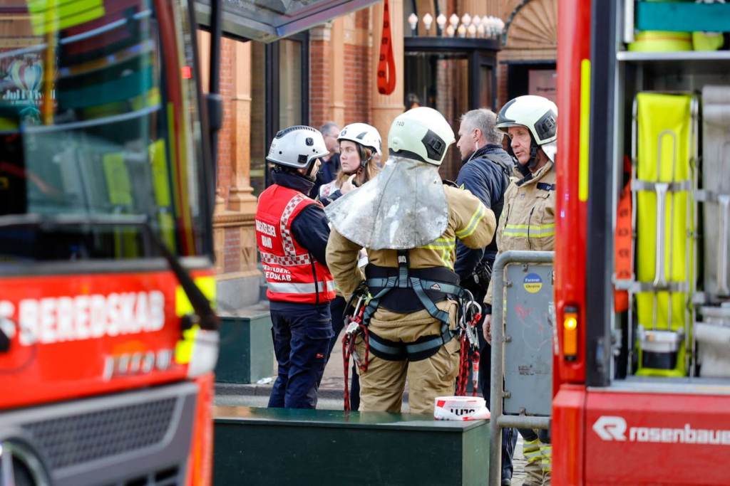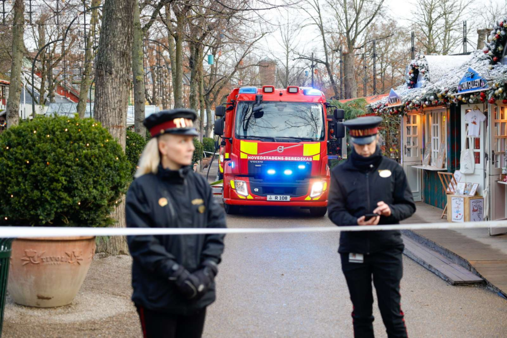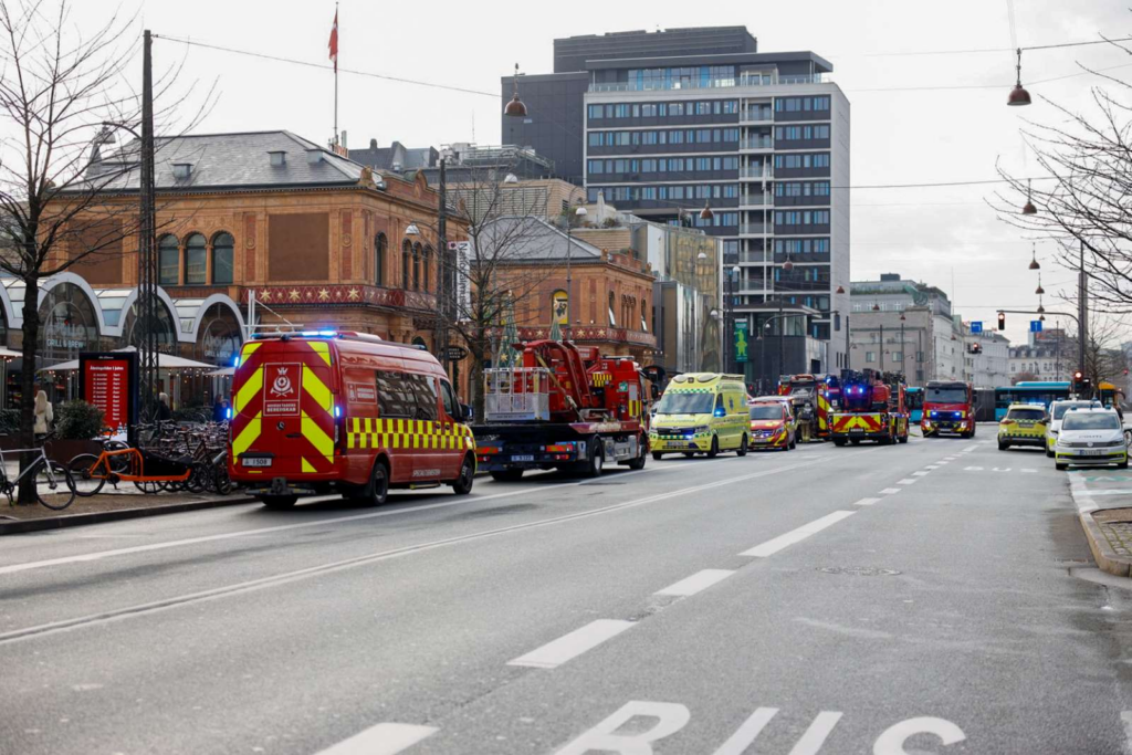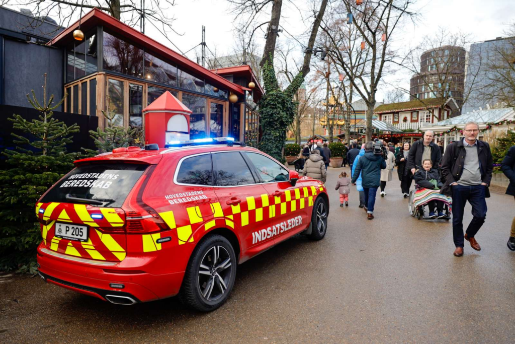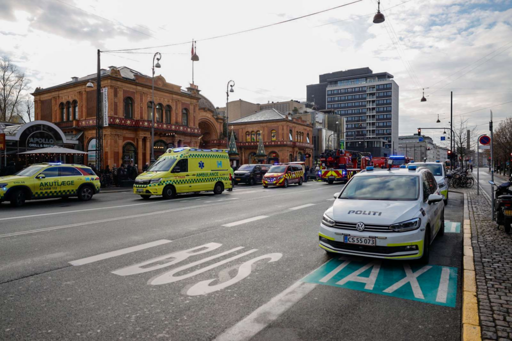 Billedet fra stedet viser onsdag eftermiddag kort før klokken 13.00, at en akutlægebil og en ambulance sammen med en lang række brandbiler og politikøretøjer er til stede foran Tivolis hovedindgang på Vesterbrogade i Indre By.