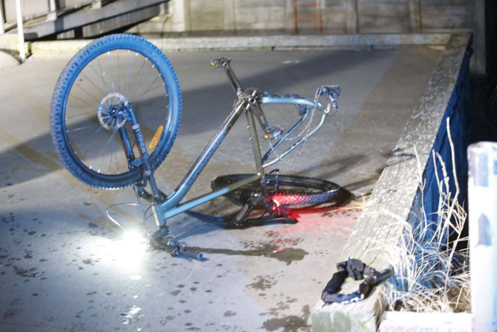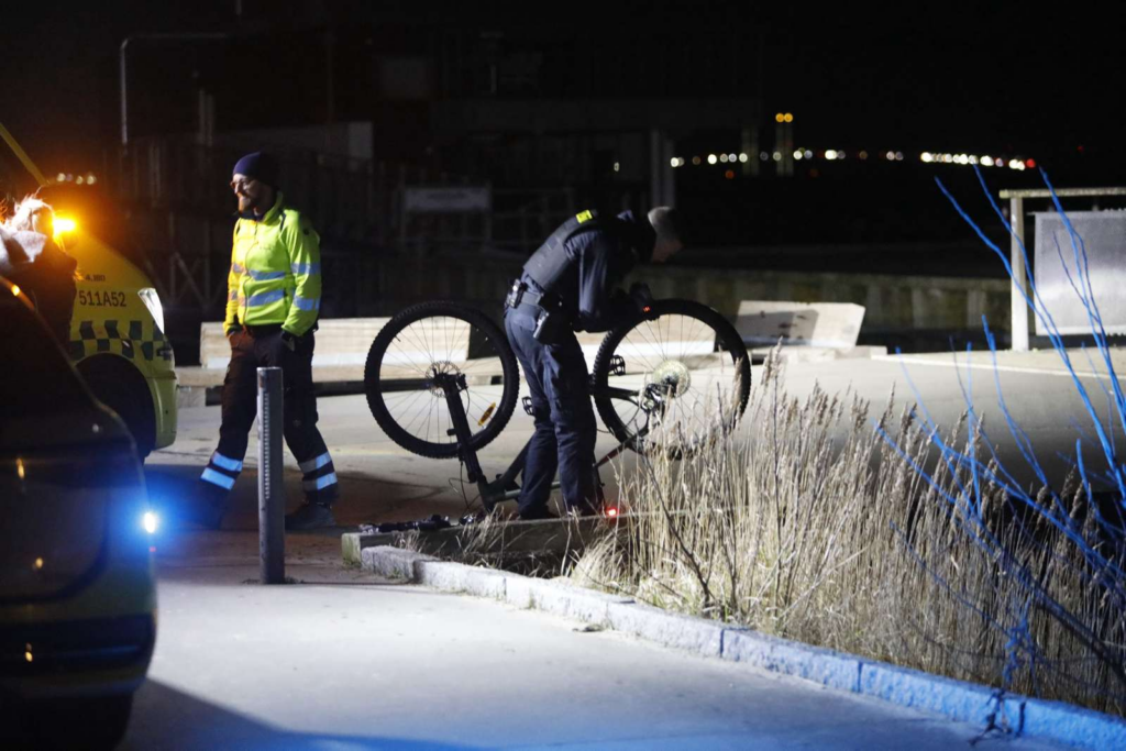 Billeder fra stedet viser, at betjente er i gang med at inspicere den pågældende cykel, som manden har brugt. Cyklen fremgår meget ødelagt.