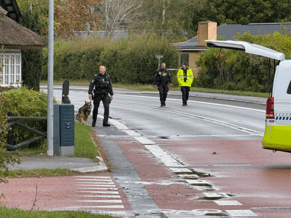 Billeder fra stedet viser, at adskillige politibiler og betjente herunder hundepatruljer er til stede i området, mens et stykke omkring en villavej og en grusvej er blevet spærret.