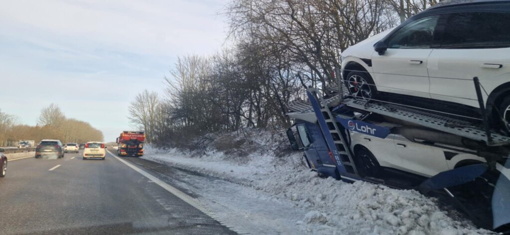Billeder fra Presse-fotos.dks udsendte viser, hvordan transporten er endt i nødsporet, hvor bilerne nærmest ligger på skrå op på laddet.