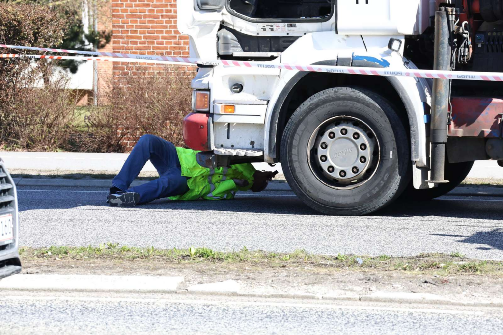 “Derudover ligger der et hvidt lagen over noget, som ligger under lastbilen – og der hænger også et hvidt lagen på siden af lastbilen. Der ligger samtidig en sko på vejen.”