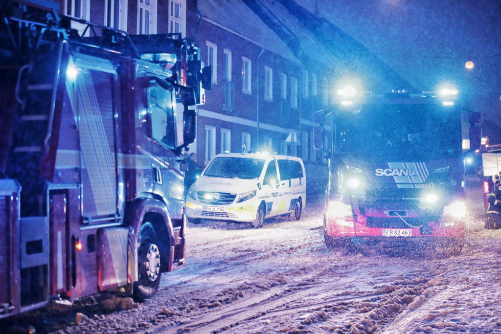 Billeder fra stedet viser, at beredskabet er til stede i flere udrykningskøretøjer og arbejder omkring en etageejenedom.
