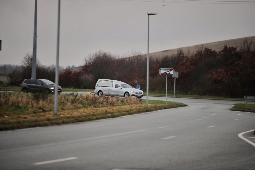 Fra kirken fortsatte kisten og de sørgende gæster videre til Alsundvej, hvor kollegaer fra Esbjerg Gods var klar til at følge Magnus på den sidste rejse.