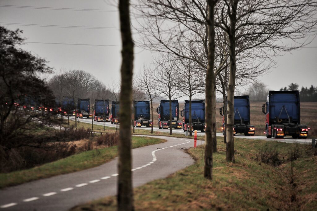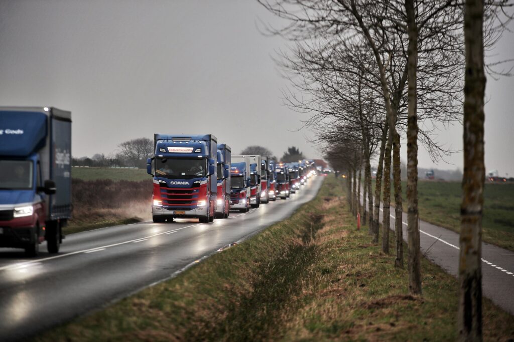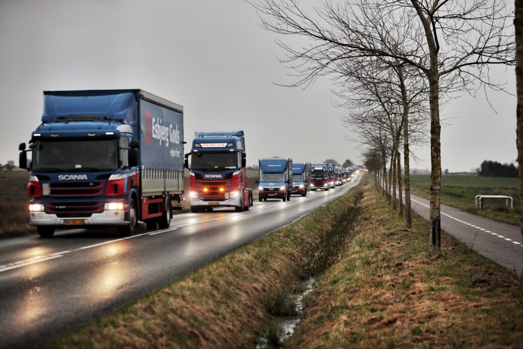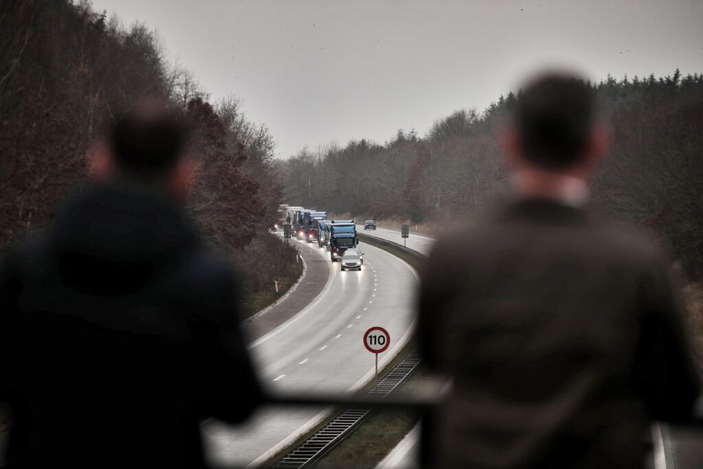 I en lang kortege kørte 40 til 50 lastbiler efter bilen, som fragtede kisten afsted på landevejen og motorvejen.