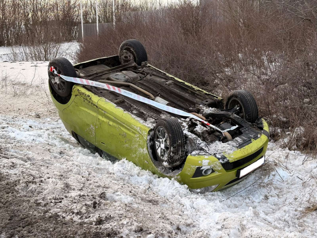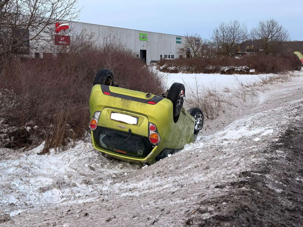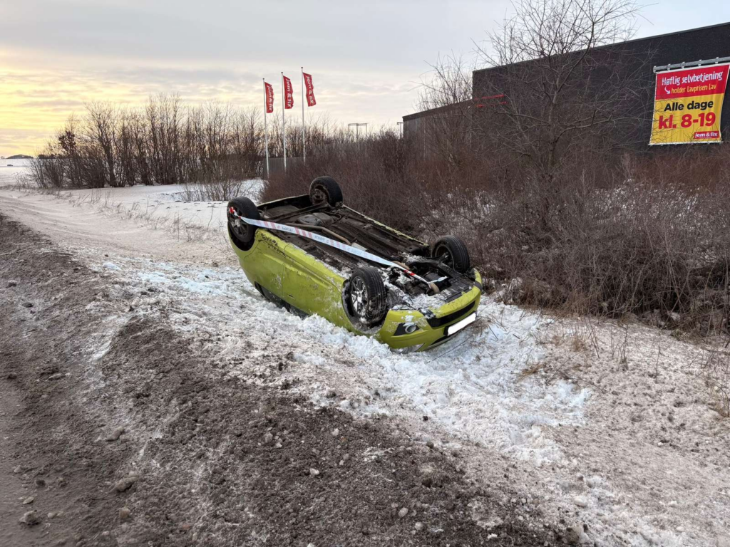 På billeder fra stedet kan det ses, at en grøn bil har været involveret i uheldet og nu ligger på taget ved kanten af vejen.