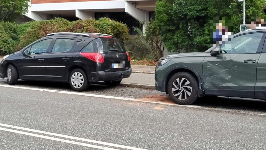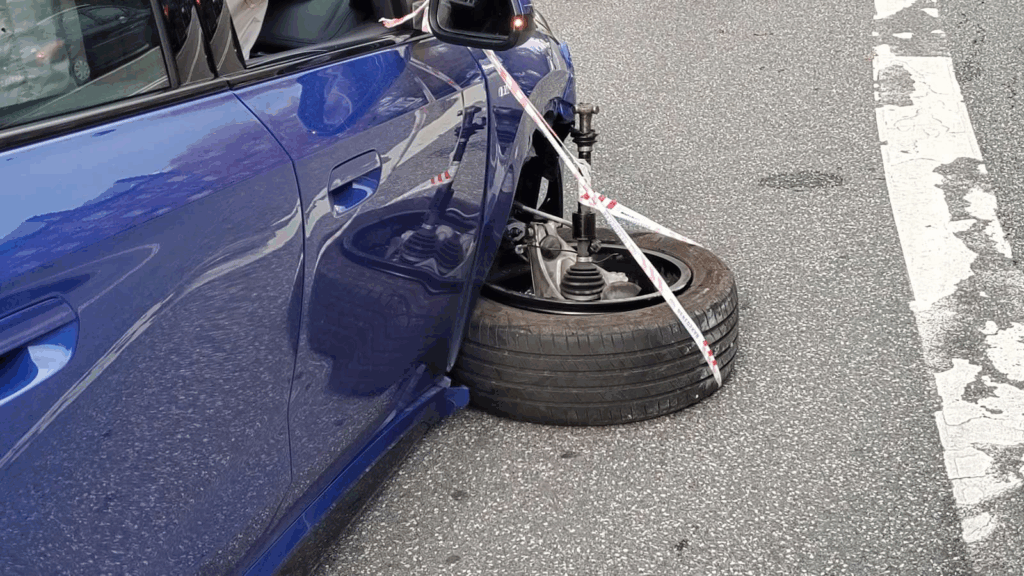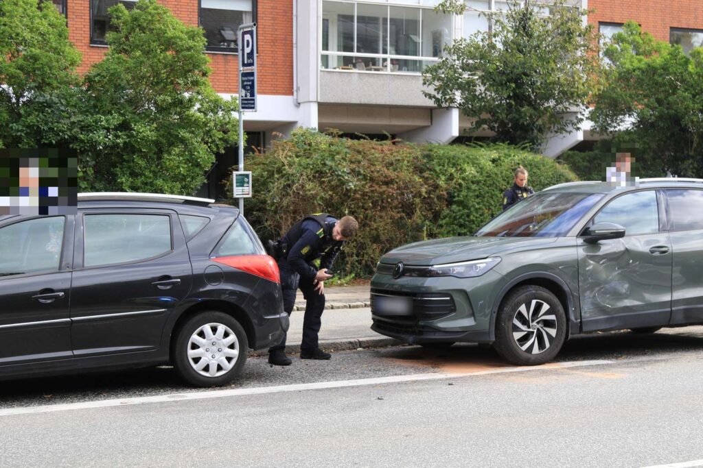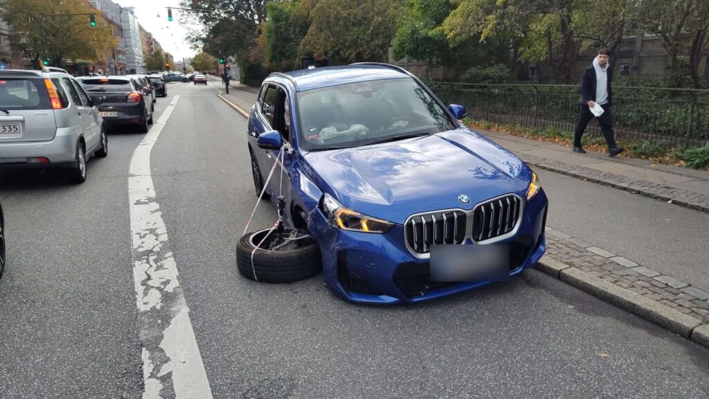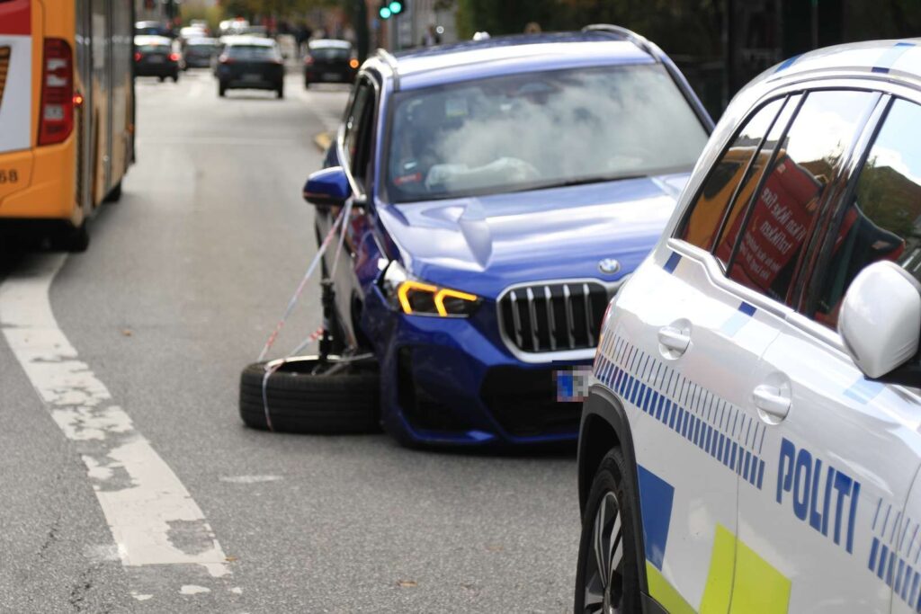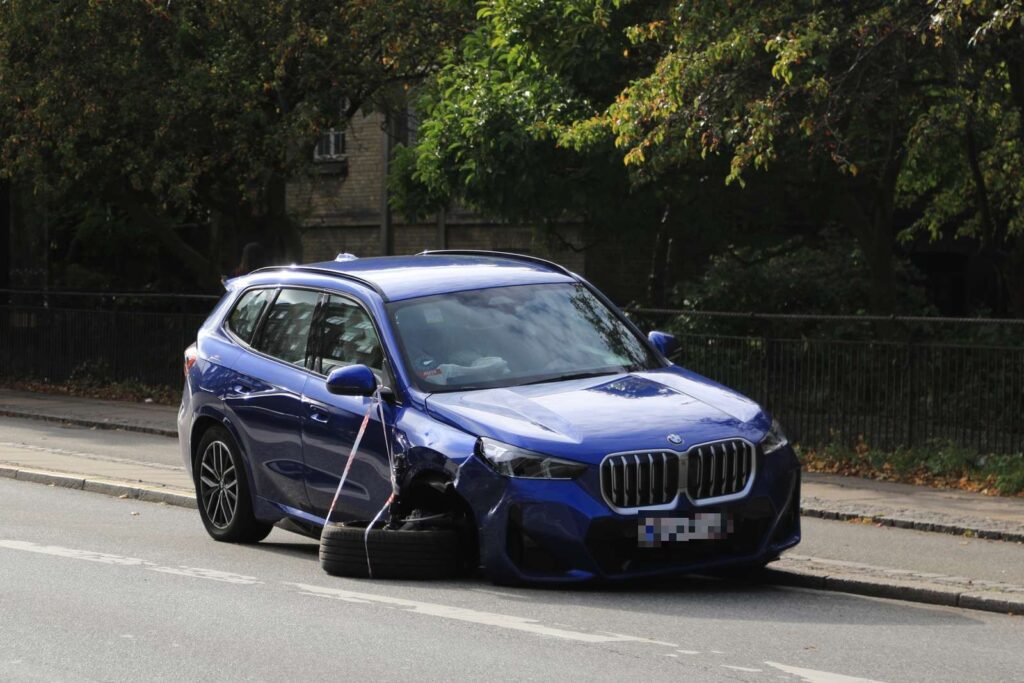 Øjensynligt står tre personbiler efterladt med skader efter uheldet, hvoraf den ene bils højre fordæk er faldet af.
