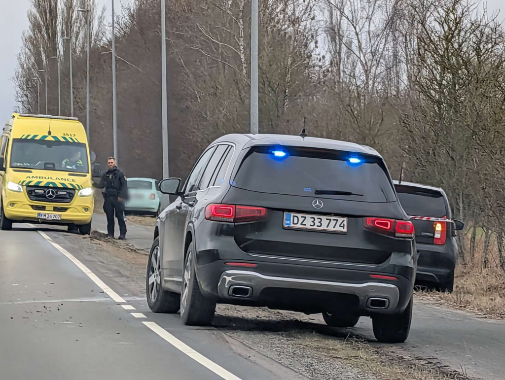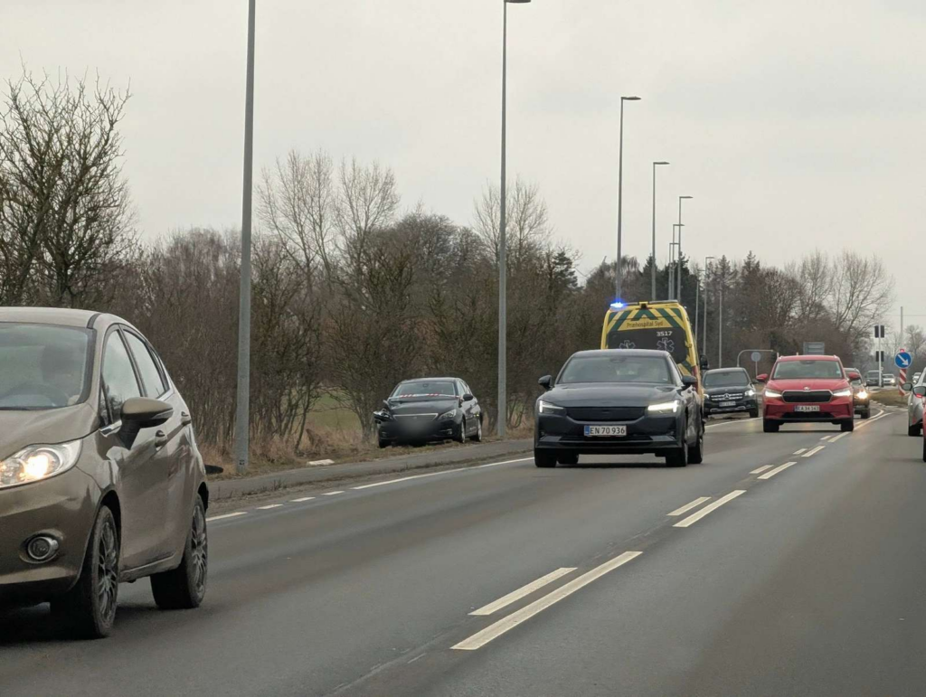 “To biler er stødt ind i hinanden. Ligner ikke et voldsomt uheld. Ambulance og politi er på stedet,” siger vores udsendte.