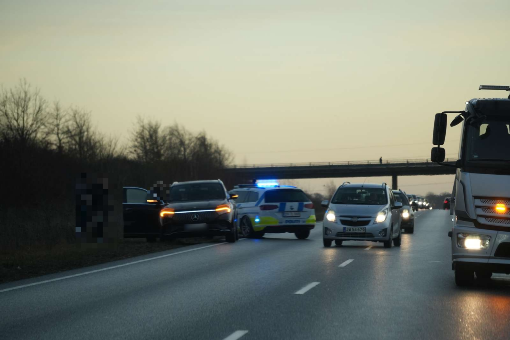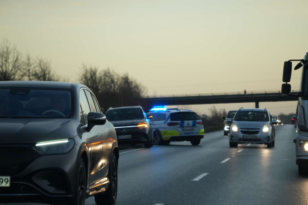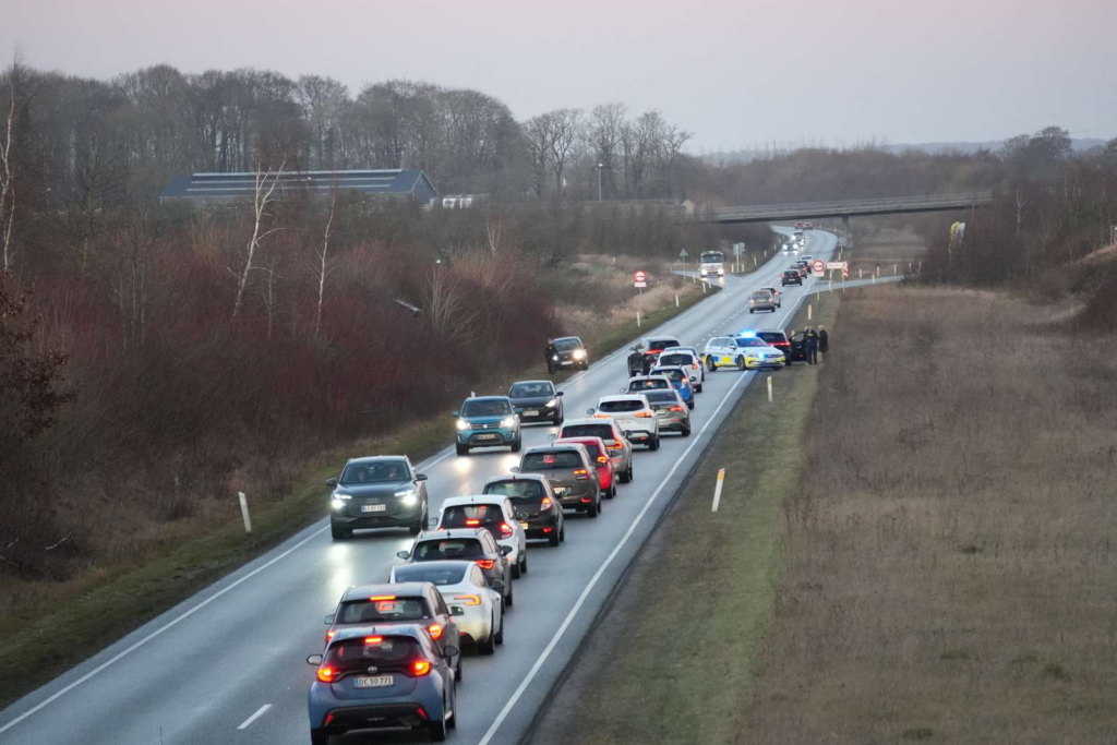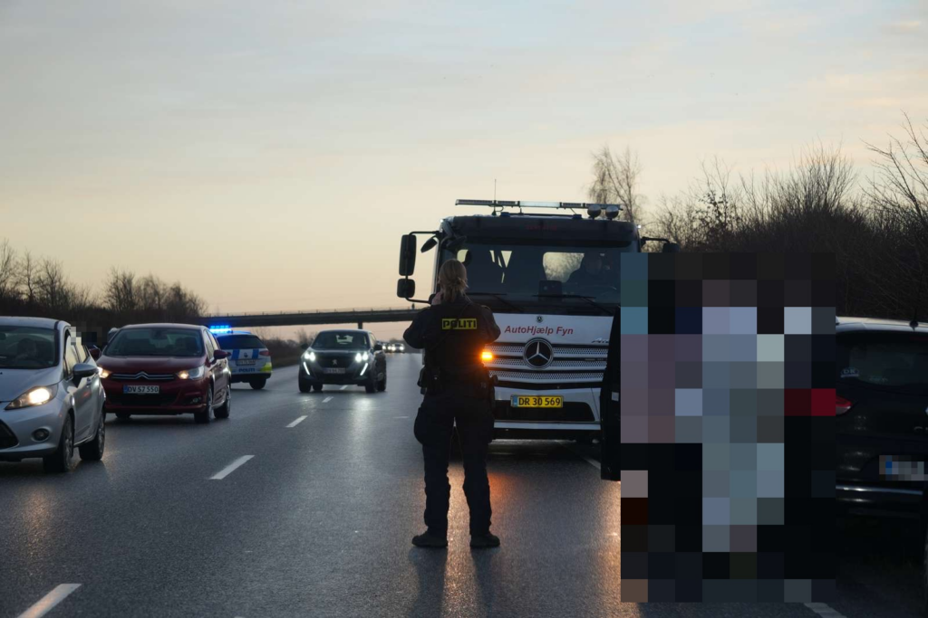 Flere personer står ved køretøjer, der er holdt ind til siden på Østre Ringvej i Odense.