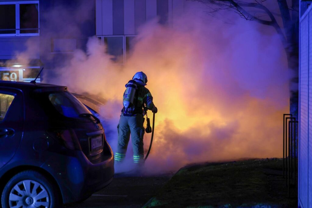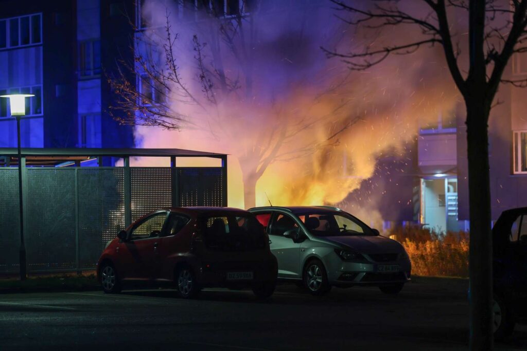 I følge Presse-fotos.dks udsendte, så var politiet også på stedet, hvor de var i gang med afhøringer. Det ser ud til, at mindst to biler fik flammerne fat,