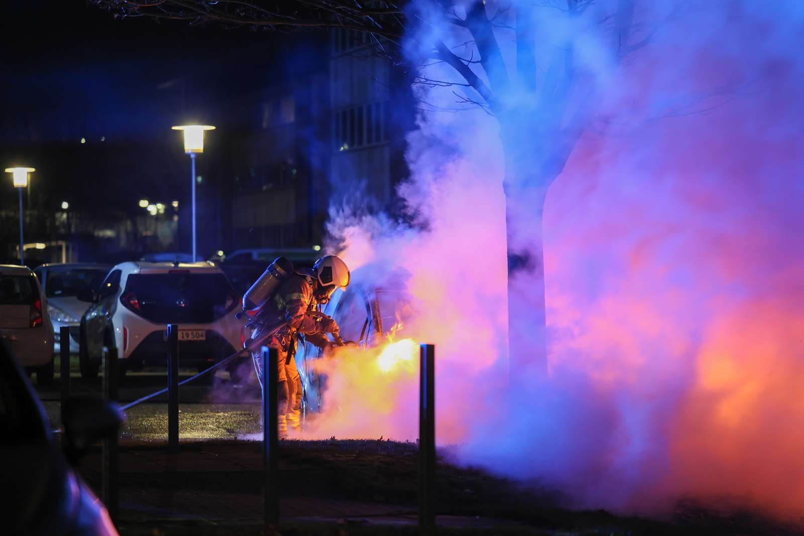 De brandene biler, står tæt på en boligblok, så brandvæsenet forsøger at forhindre en spredning til huset.