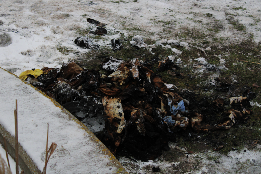Videomateriale fra stedet viser brandfolk komme ud fra campus med vasketøjskurven, der står i flammer.
