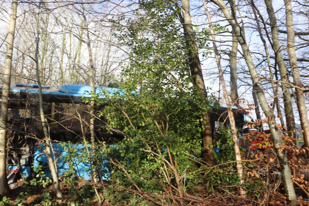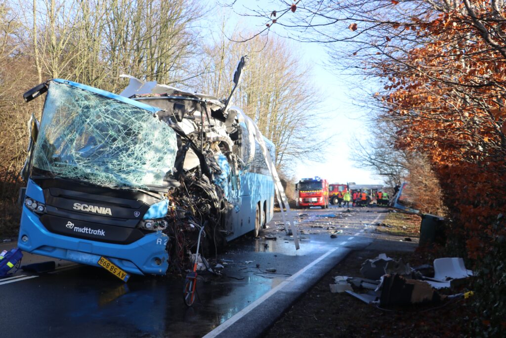 Den anden bus er desuden endt i grøften også med store skader. Det viser billeder, som Presse-fotos.dk ikke kan bringe.
