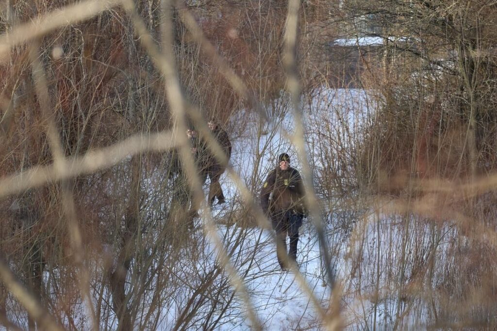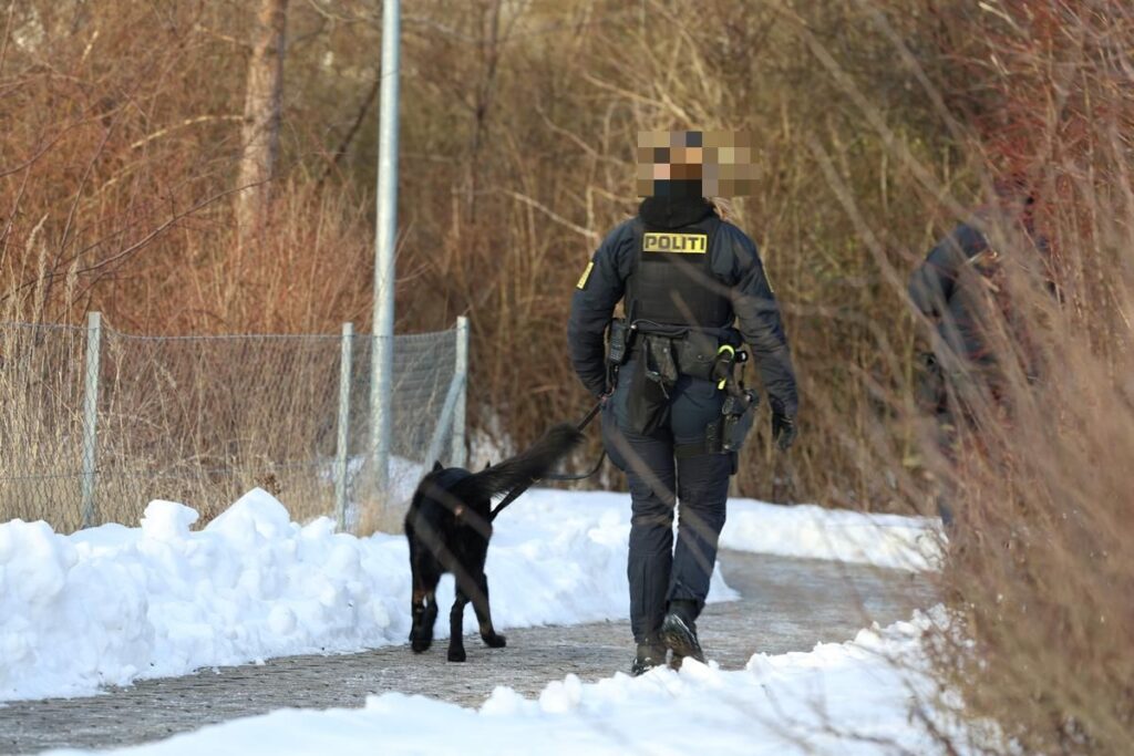 Det foregår blandt andet omkring en nærliggende sø, hvor betjente gennemsøger terrænet og løbende samler genstande op. Arbejdet foregår metodisk, og både hundepatrulje, indsatsleder og efterforskere er til stede.
