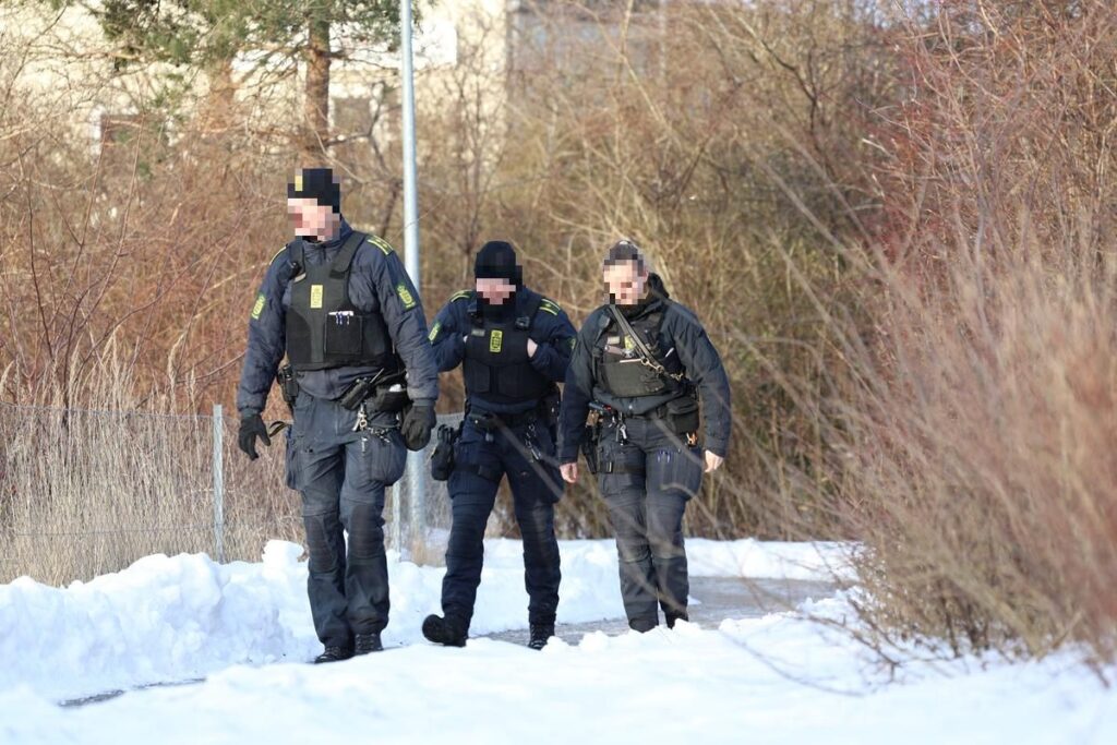 Blå blink præger området, og politiet arbejder i et større terræn, hvor betjente bevæger sig systematisk rundt.
