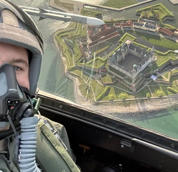 Fra cockpittet tog kronprinsen flere billeder, blandt andet et selfie, hvor han sidder med iltmasken på og Kronborg Slot i baggrunden.