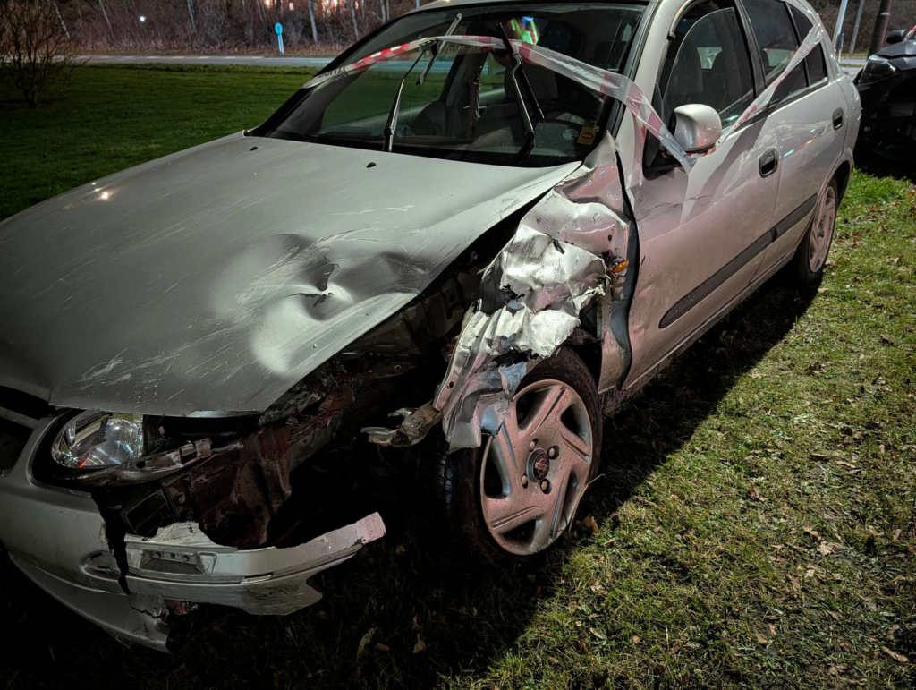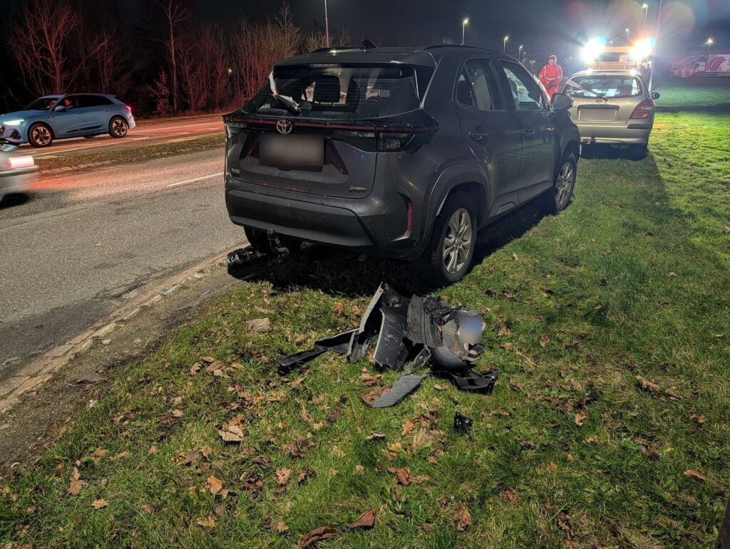 Det andet involverede køretøj, en større, mørk personbil, ses også med store skader på fronten. Vragdele fra bilen ligger i området.
