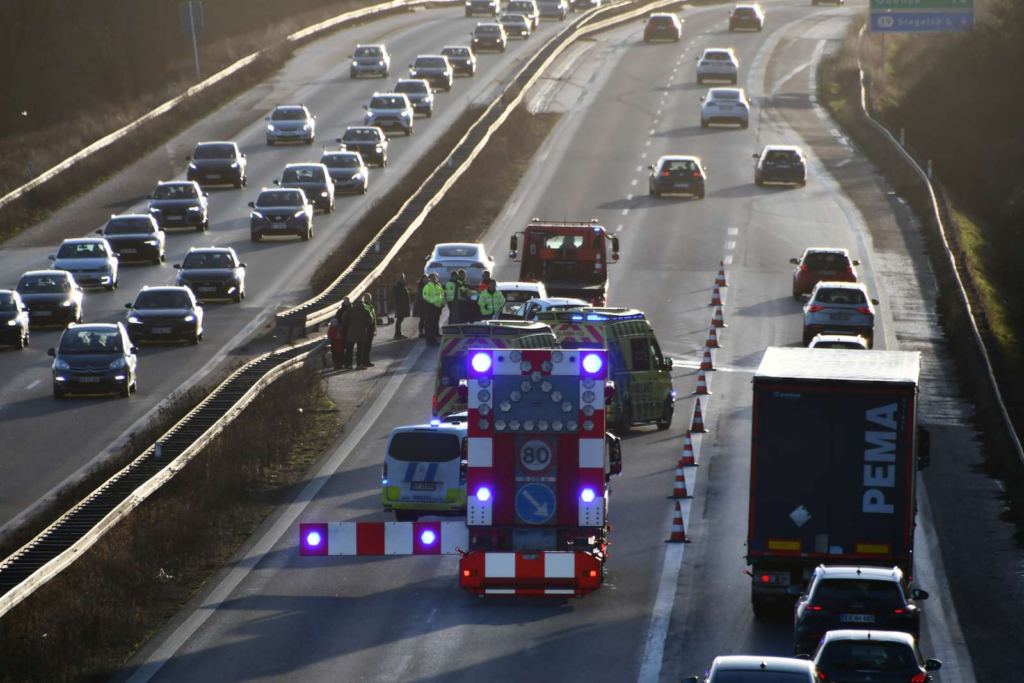 Uheldet er sket på E20 ved Slagelse Øst, hvor trafikken i vestgående retning i øjeblikket står helt stille.