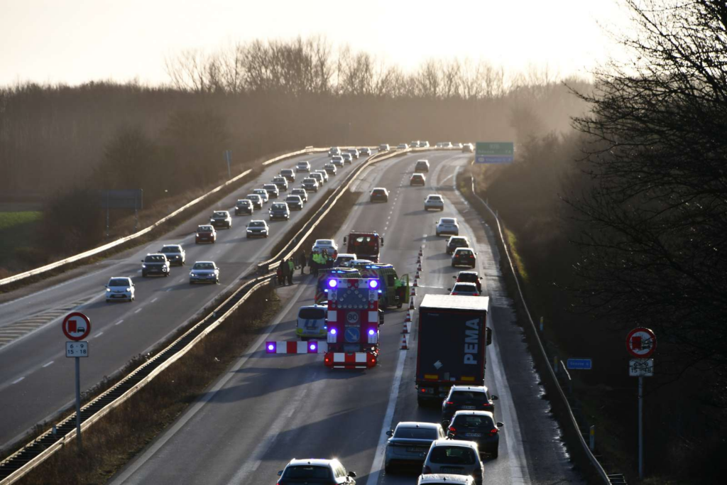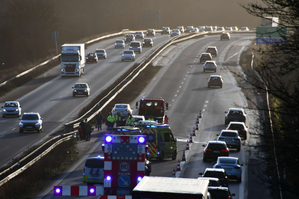‘Vi er i øjeblikket til stede ved et færdselsuheld på Vestmotorvejen i vestgående retning, umiddelbart efter afkørsel 38 Slagelse. Begge spor er pt. spærret.’