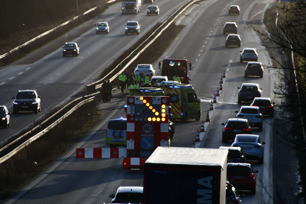Politi og redningsmandskab er i øjeblikket massivt til stede, hvor arbejdet med at sikre uheldsstedet og skabe overblik fortsat pågår. Bilister må derfor forvente betydelige forsinkelser, mens situationen håndteres.