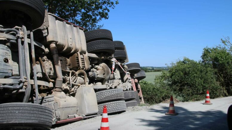 Lastbil vælter ud over skrænt: Chauffør fanget i førerhuset