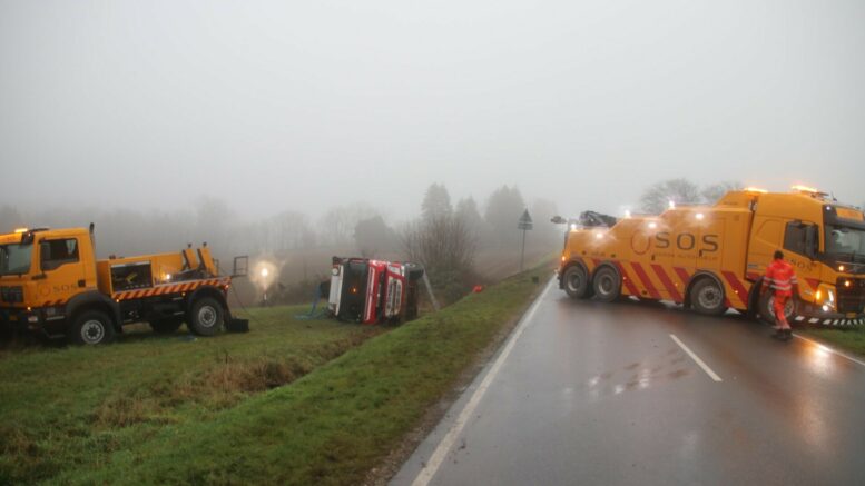 Vej spærret: Lastbil vælter ned i grøft