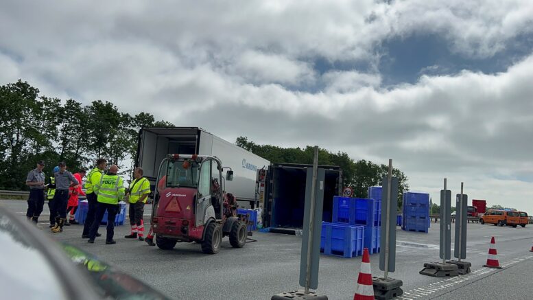 Trafikken op Fynske Motorvej stadig påvirket efter væltet kødtransport