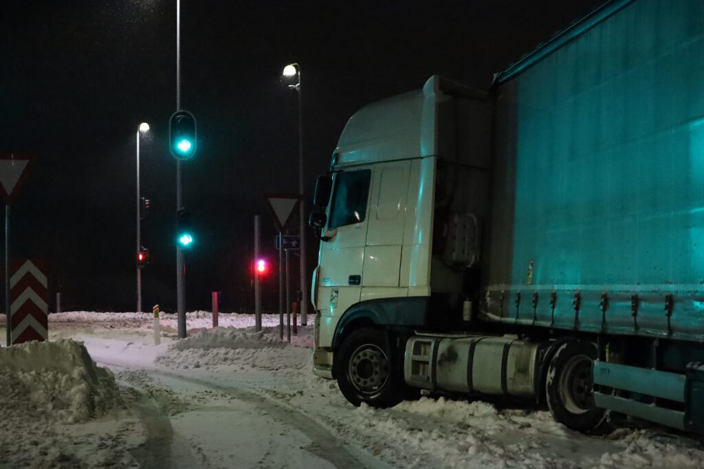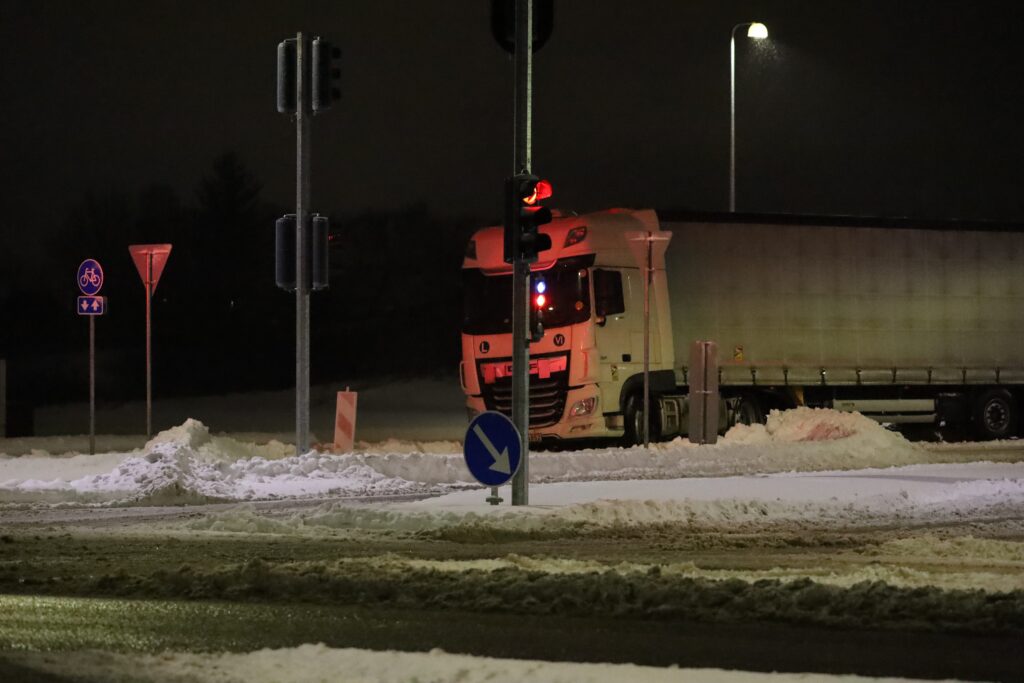 Lastbilen er blevet efterladt lige før et lyskryds, hvor den holder på tværs af vejen.