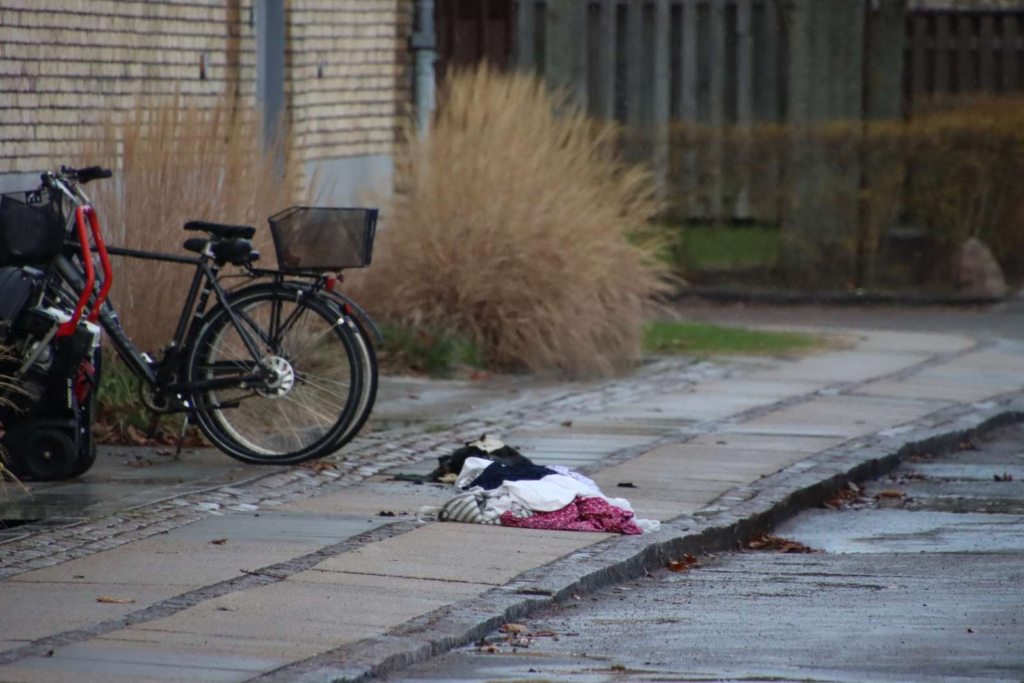 “Det ser ud, som om der var ild i noget tøj. eller stof. der lå på gaden, og som er blevet slukket,” siger Presse-fotos.dks udsendte.