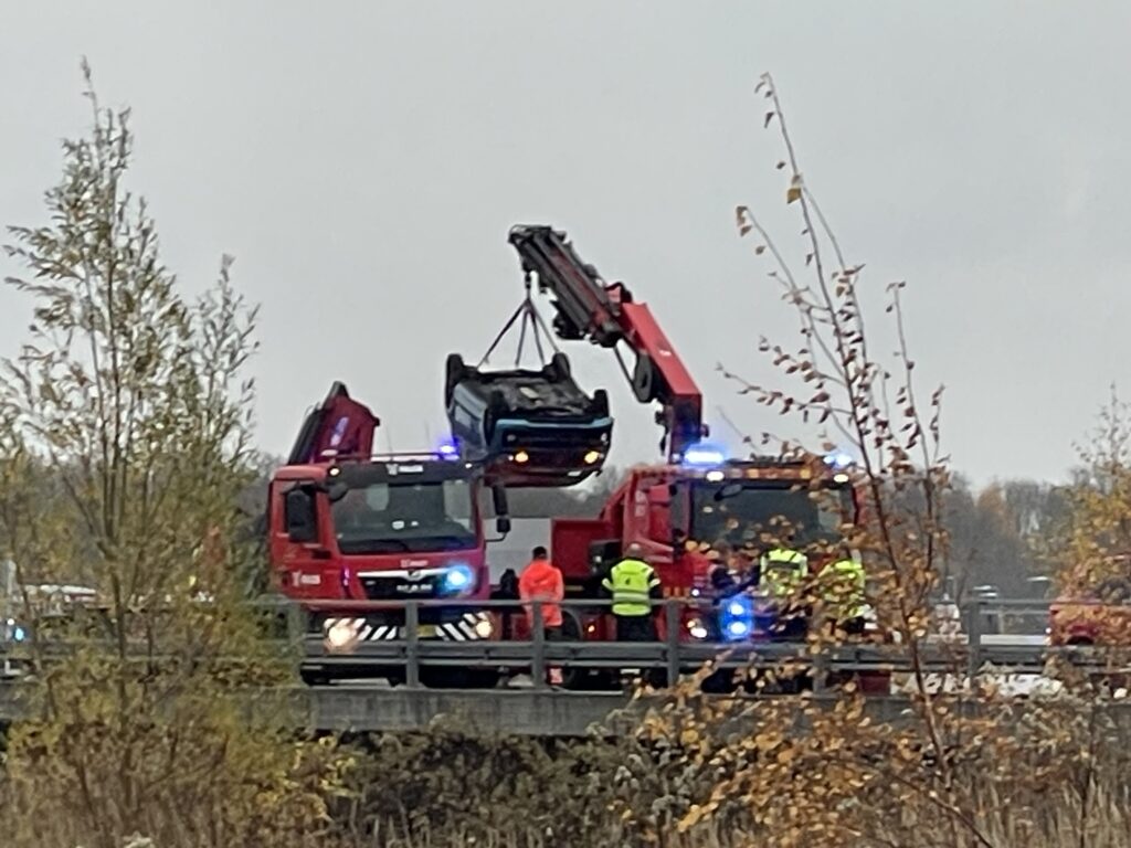 Politi og redning er fremme på stedet, hvor bilen nu er i gang med at blive fjernet med en kran.