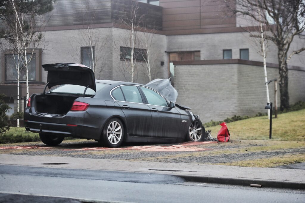Bilen er godt ødelagt foran, og det ligner, at der har været brand i kølerhjelmen.