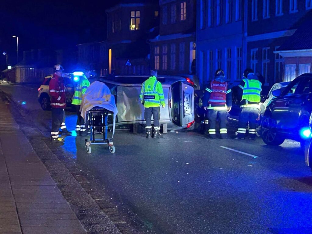Billeder fra stedet viser, at en forulykket bil ligger på siden og spærrer for vejen.