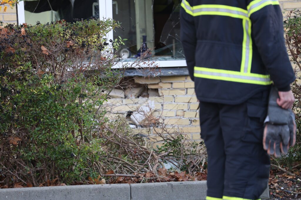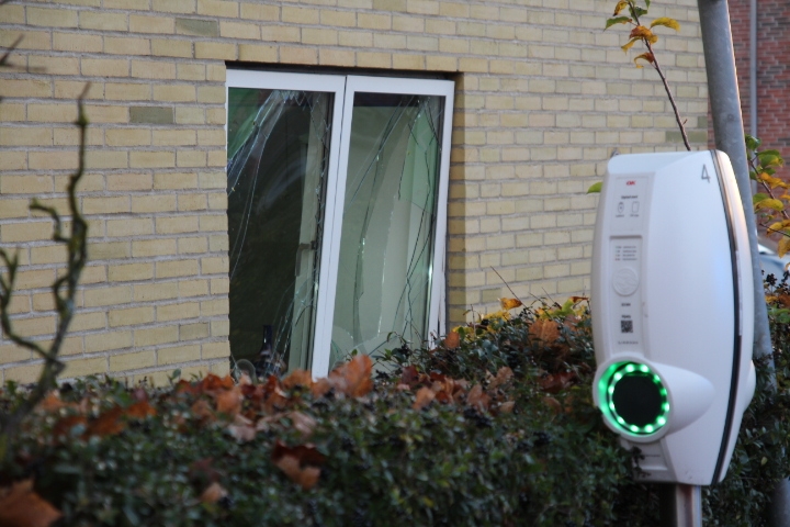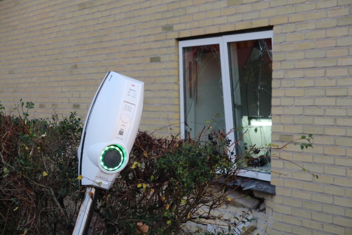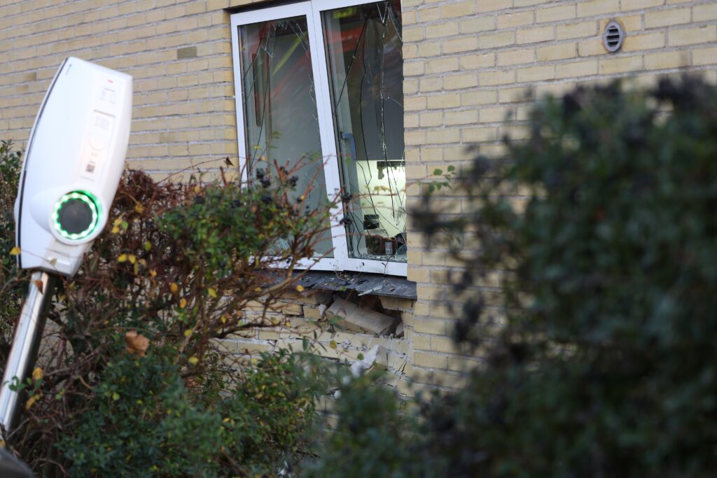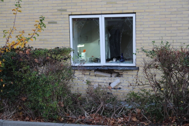 Muren er blevet påkørt lige under et vindue ind til et køkken. Ruden er itu, og der er glassskår og murbrokker spredt ved hændelsen.
