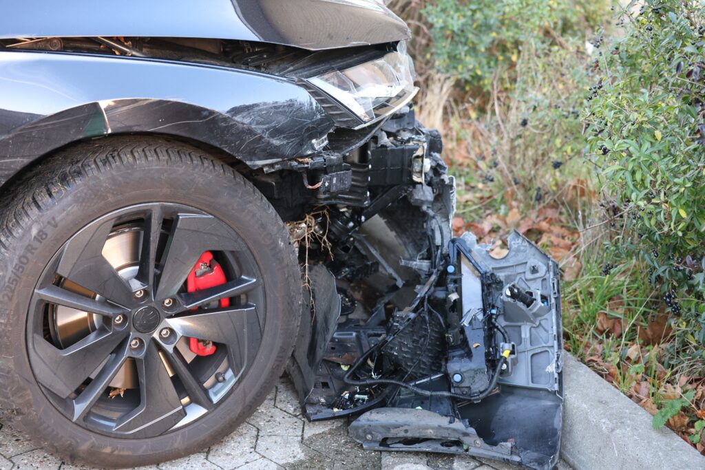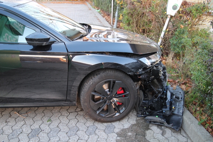 Billeder fra stedet viser, hvordan både bygningsmuren og køretøjet har lidt stor skade.