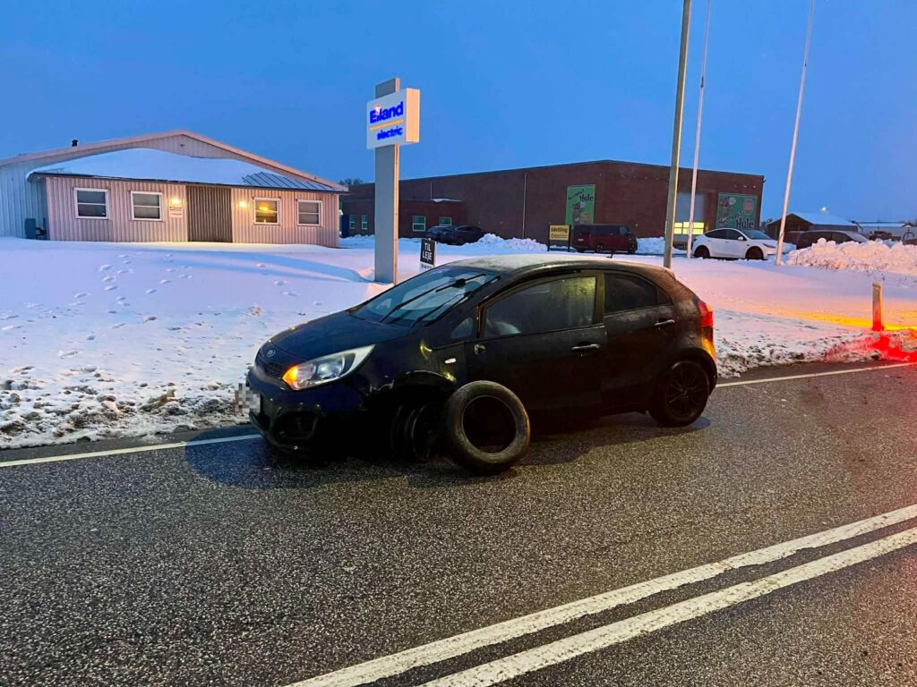 Midt i afspærringen holder en bil med massive skader. Køretøjet bærer tydeligt præg af et voldsomt sammenstød, og vragrester ses omkring bilen.
