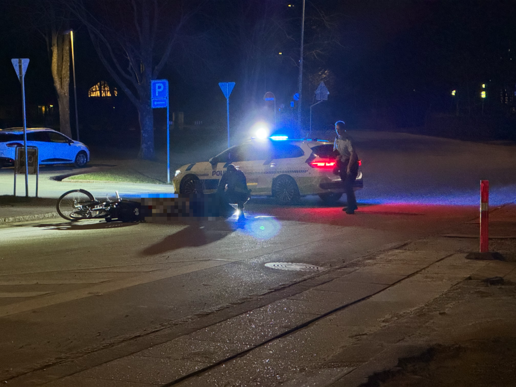 På billeder fra Presse-fotos.dks udsendte ses manden ligge på vejen ved siden af en cykel.