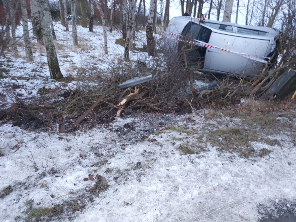 Der har udspillet sig ubehagelige scener på en landevej, hvor en bil er endt uden for kørebanen efter en ulykke.