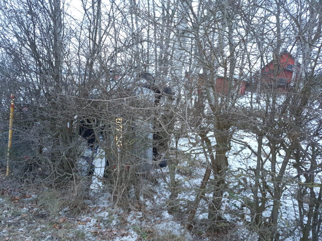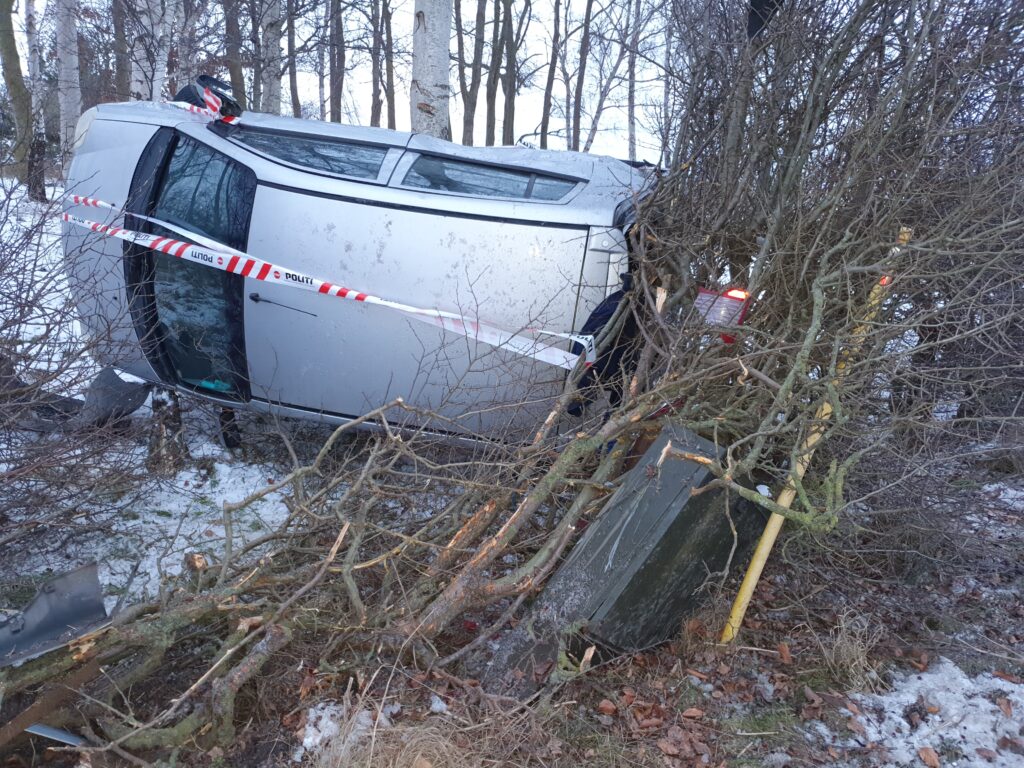 Ifølge oplysninger fra Presse-fotos.dks fotograf på stedet er bilen kørt i noget krat og har blandt andet revet et mindre elskab op.