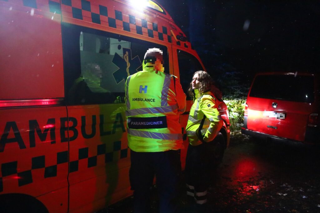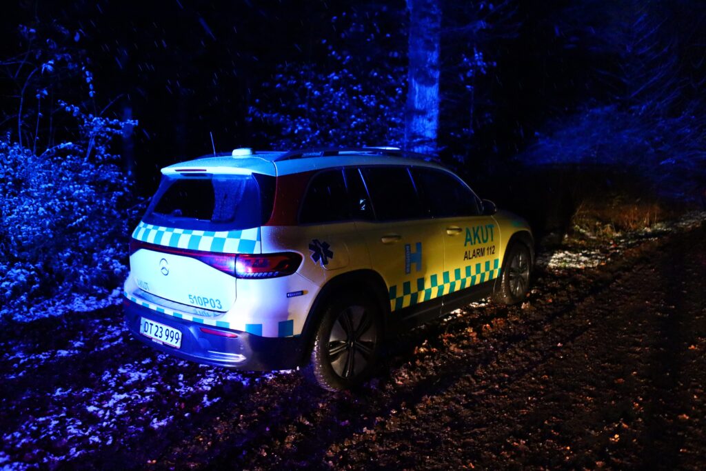 I det mørke skovområde har en ulykke fundet sted. Personer tilses nu i en ambulance på stedet.