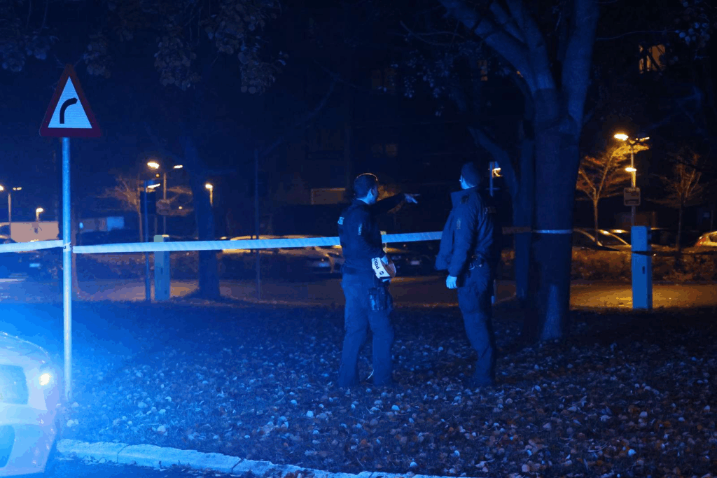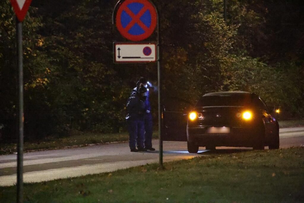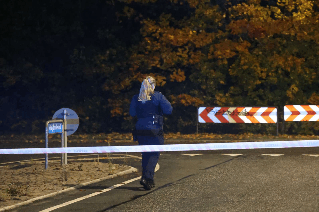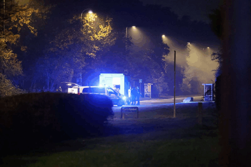 Området er fortsat præget af politiets aktivitet, og teknikere arbejder i mørket iført dragter og pandelamper, mens de dokumenterer spor omkring bilen.