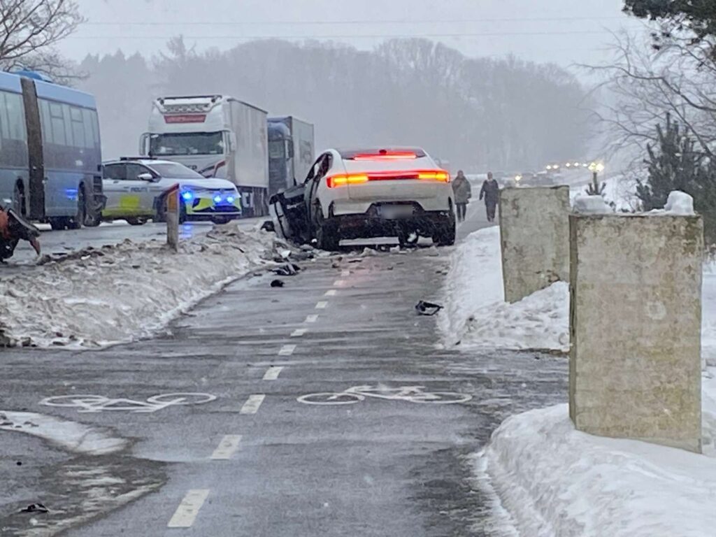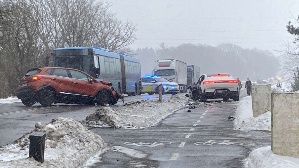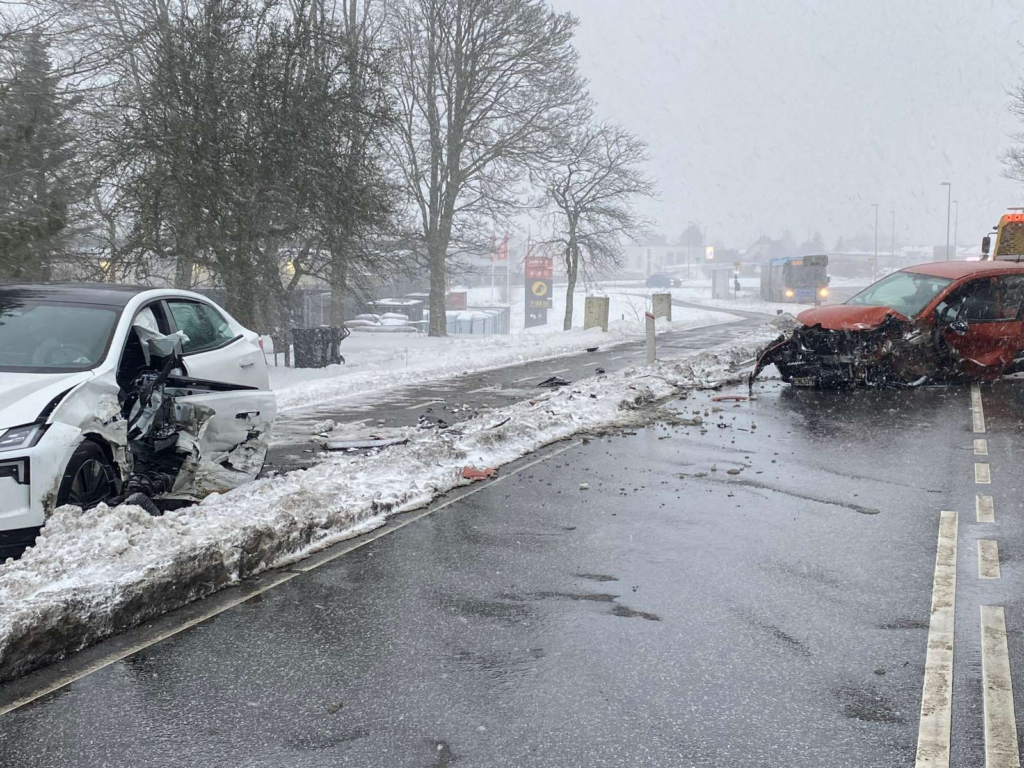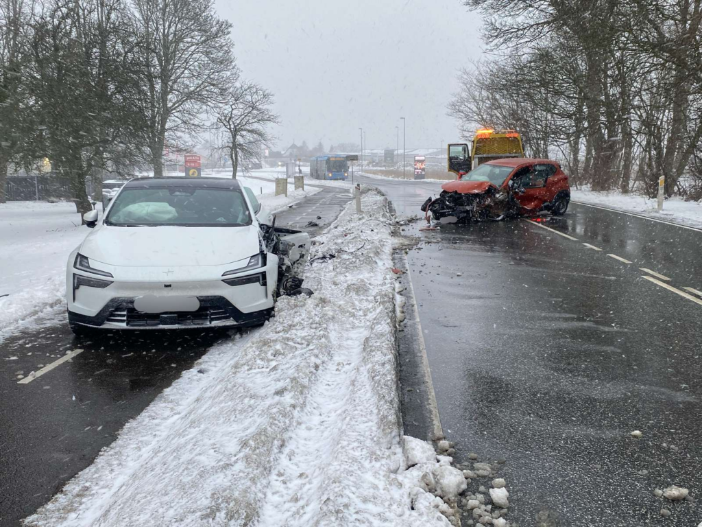 Billeder fra stedet indikerer, at uheldet er et frontalsammenstød, da begge køretøjer har store skader i fronten.