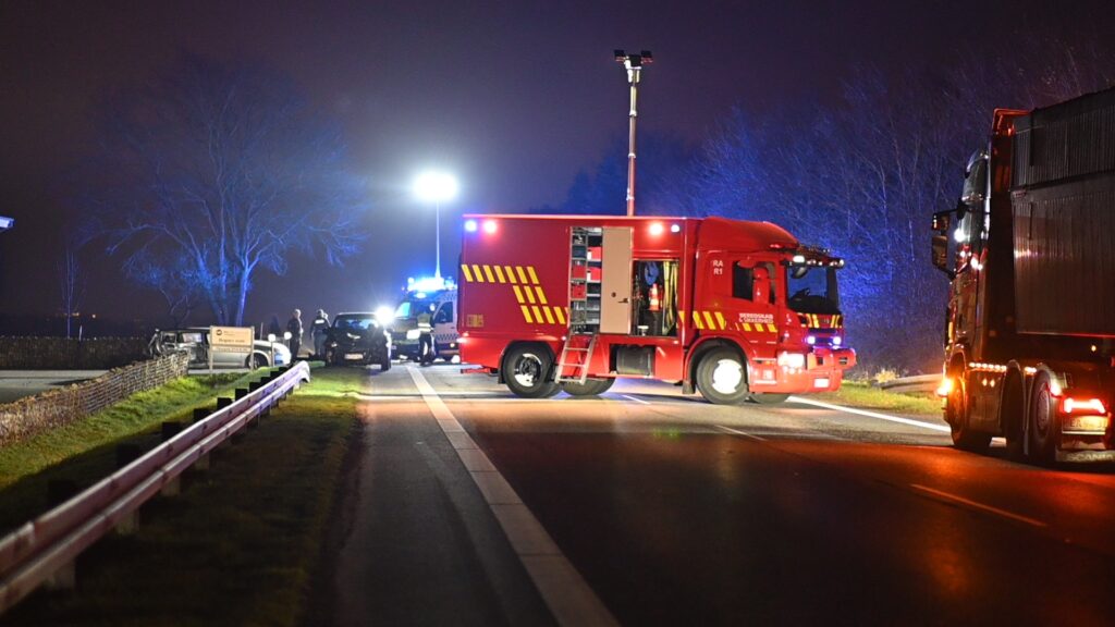 Politi, ambulance og beredskab er fremme ved ulykkesstedet, hvor vejen har været lukket helt, mens redningsarbejdet har været i gang.