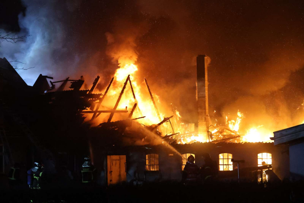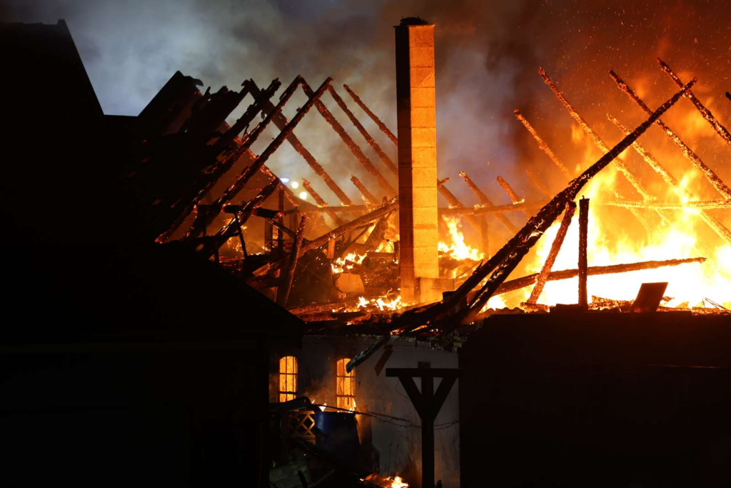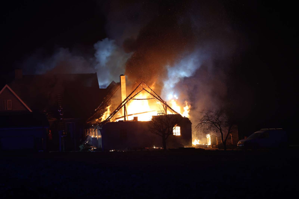 “Det er et rent flammehav. Hele tagkonstruktionen styrtede på et tidspunkt sammen. Det er et værksted, der er brudt i brand – men jeg kan se, at flammerne har spredt sig til hovedhuset,” siger vores udsendte.